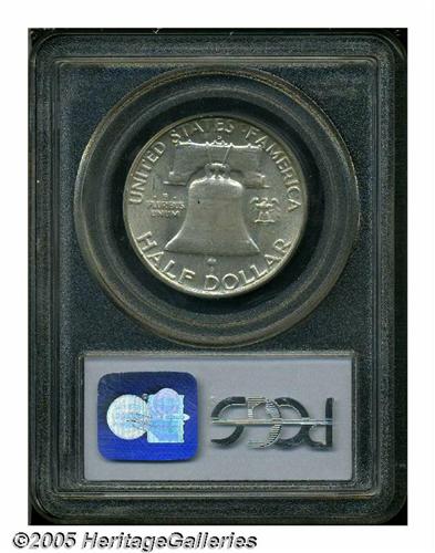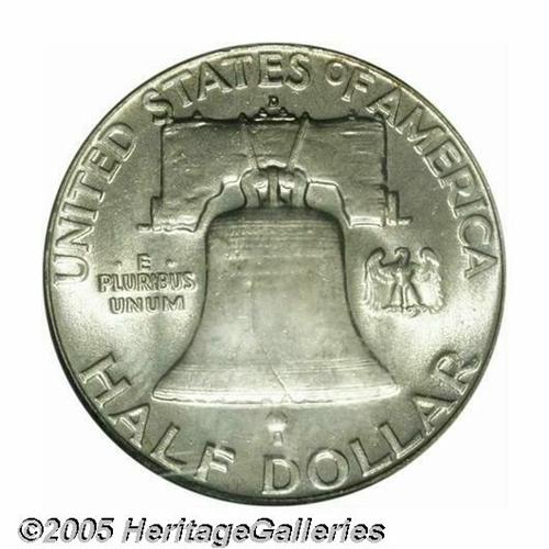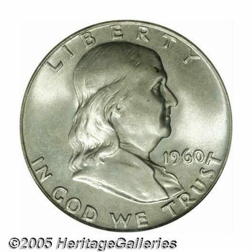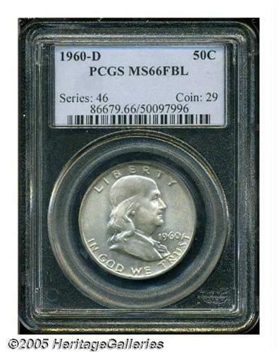 <B>1960-D<50C> MS66 Full Bell Lines PCGS.</B></I> This example is tied with a few others for honors as the finest certified example of the date. This is one of the most elusive Franklins in the entire series when in high-grade. Note the words of Rick Tomaska: "While average brilliant examples of this date have languished in value of late, this date is in the highest demand in superb MS66 or MS66 FBL grade. It is a key date in this condition. Superb [MS66] specimens command huge premiums commensurate with their status within the series." This example is brilliant with satiny luster and wisps of light toning. Population: 12 in 66, 0 finer (5/05).