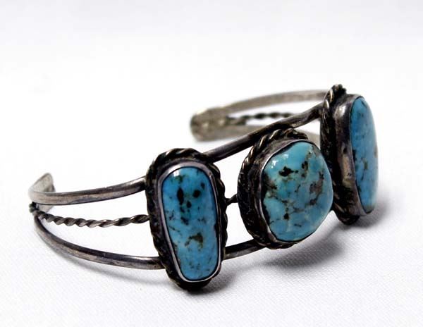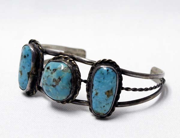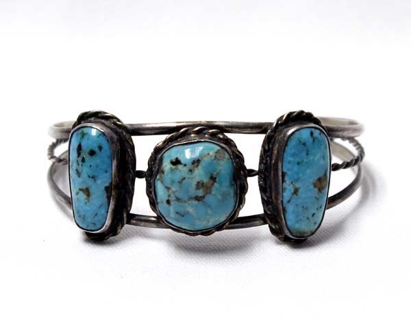 1960 Estate Native American Navajo Sterling Turquoise Bracelet, older piece of jewelry, all sterling set with large beautiful turquoise cabochons, inside measures 6.5'' which includes opening x 1''W, 23g in total wt.