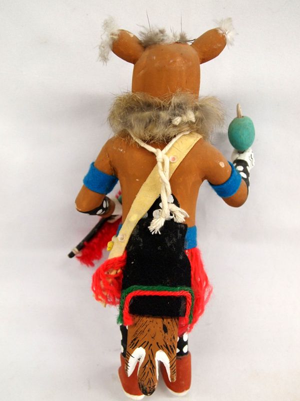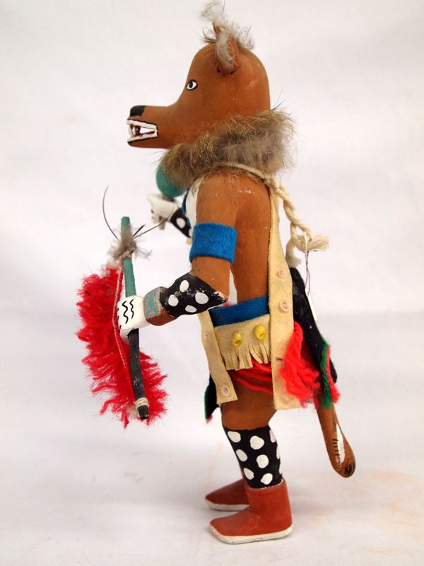 1960 Hopi Fox Kachina. Handsome Kachina has rattle gourd in one hand and a bow in the other. There is a little chip off the inside of its left ear and the left arm has been glued at the shoulder joint. It stands 10.5''H x 6''W.