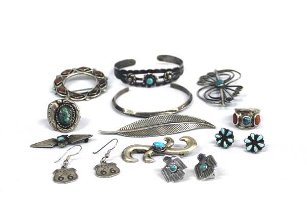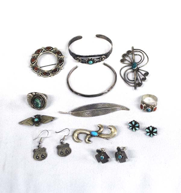 1960 Native American Jewelry, some later. Largest Navajo Sterling Silver Guard Bracelet, measures approx. 6 1/8'' inside measurement. Zuni sterling silver petit point pierced earrings.