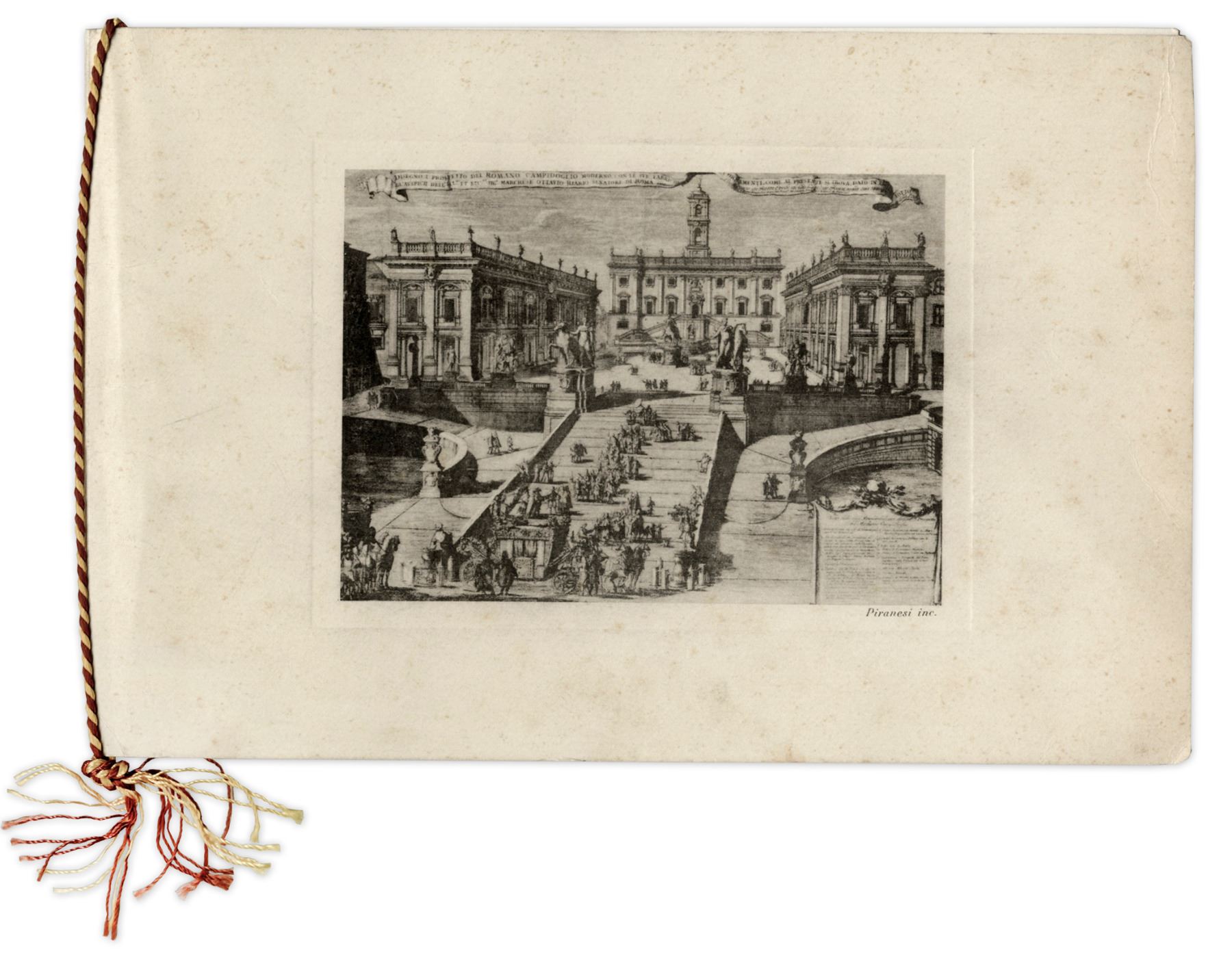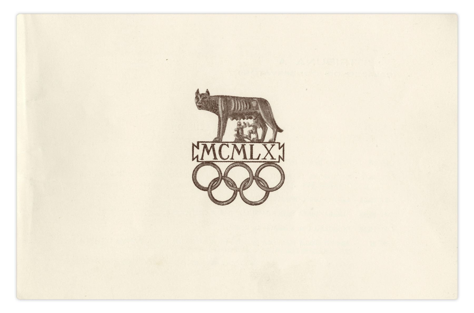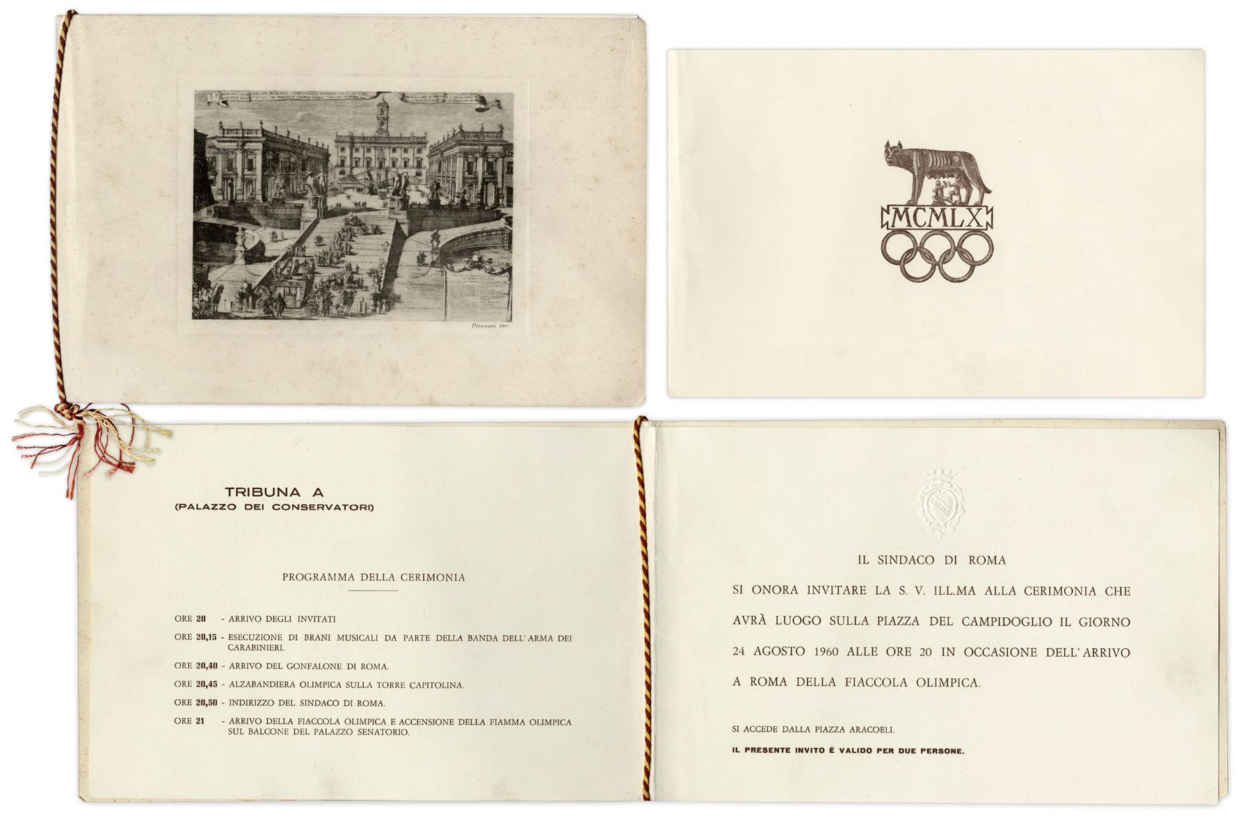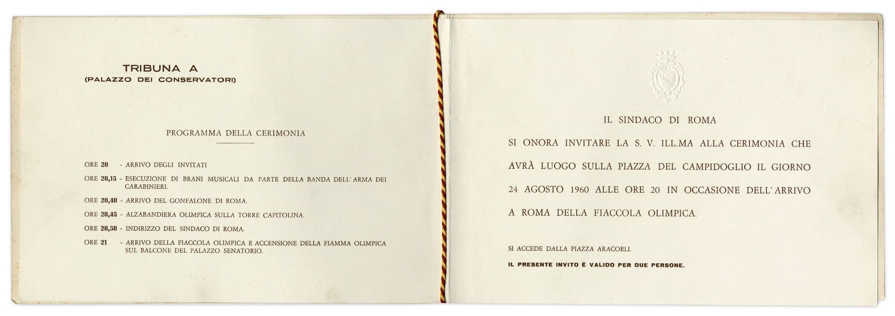 Olympic torch program from the 17th Olympic games held in Rome from 25 August-11 September 1960. Program to celebrate the arrival of the Olympic torch outlines the day's events on 24 August 1960, when the torch arrived in Rome and was placed in the Senator's Palace. 8pp. program measures 8.25'' x 5'', with an off-set engraving of the Senator's palace on the cover. Bound by gold and crimson rope, program has an embossed seal of Rome on the 4th page. Light toning and foxing, otherwise near fine.