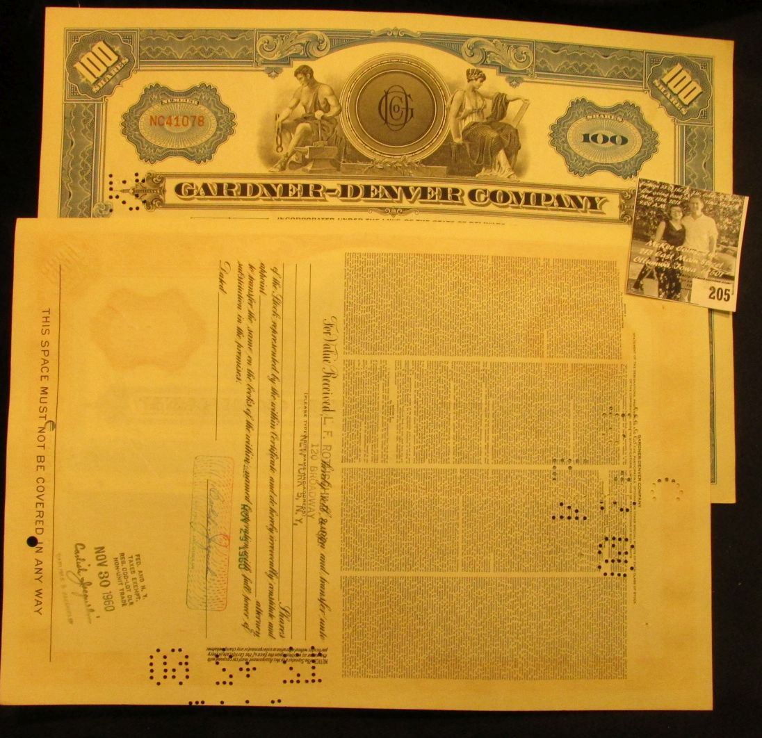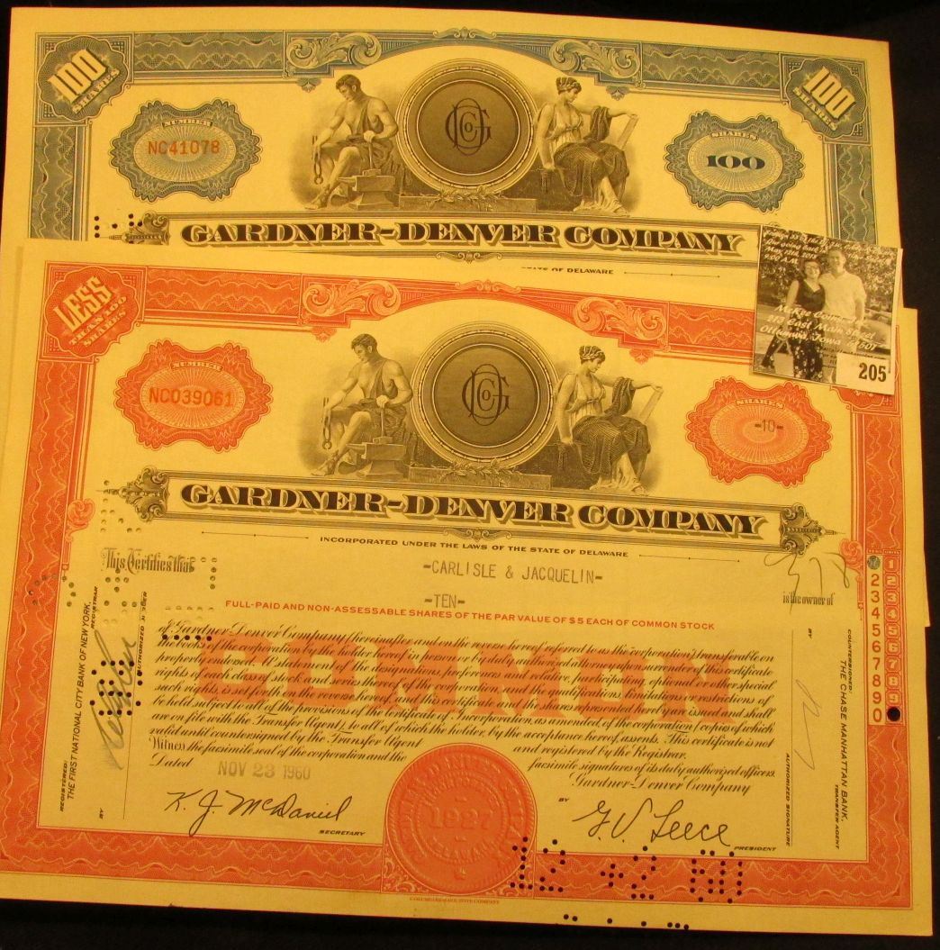 1960 One Hundred Shares Stock Certificate "Gardner-Denver Company", hole cancelled & Ten Shares Stoc