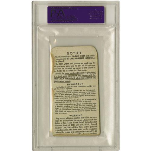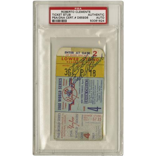 <B>1960 Roberto Clemente Signed World Series Ticket Stub.</B></I> The Pittsburgh Pirates squeaked out a three to two win in the Bronx this day to pull even in a Fall Classic that would ultimately conclude with Mazeroski's famed blast four days later. One fan chose well this day when he approached the visiting dugout and chose the Puerto Rican superstar to autograph his ticket stub. Perfect 10/10 blue ink reads, "To Ray, Roberto Clemente." The stub shows wear, with tape at each edge, but these factors do not affect the autograph in the slightest. The stub has been encapsulated for protection and unquestioned authenticity by PSA/DNA. <I>LOA from James Spence Authentication. LOA from PSA/DNA.</B></I><BR><BR><b>Shipping:</b> Small Flat (<a target="_blank" href="http://www.heritageauctions.com/common/shipping.php">view shipping information</a>)