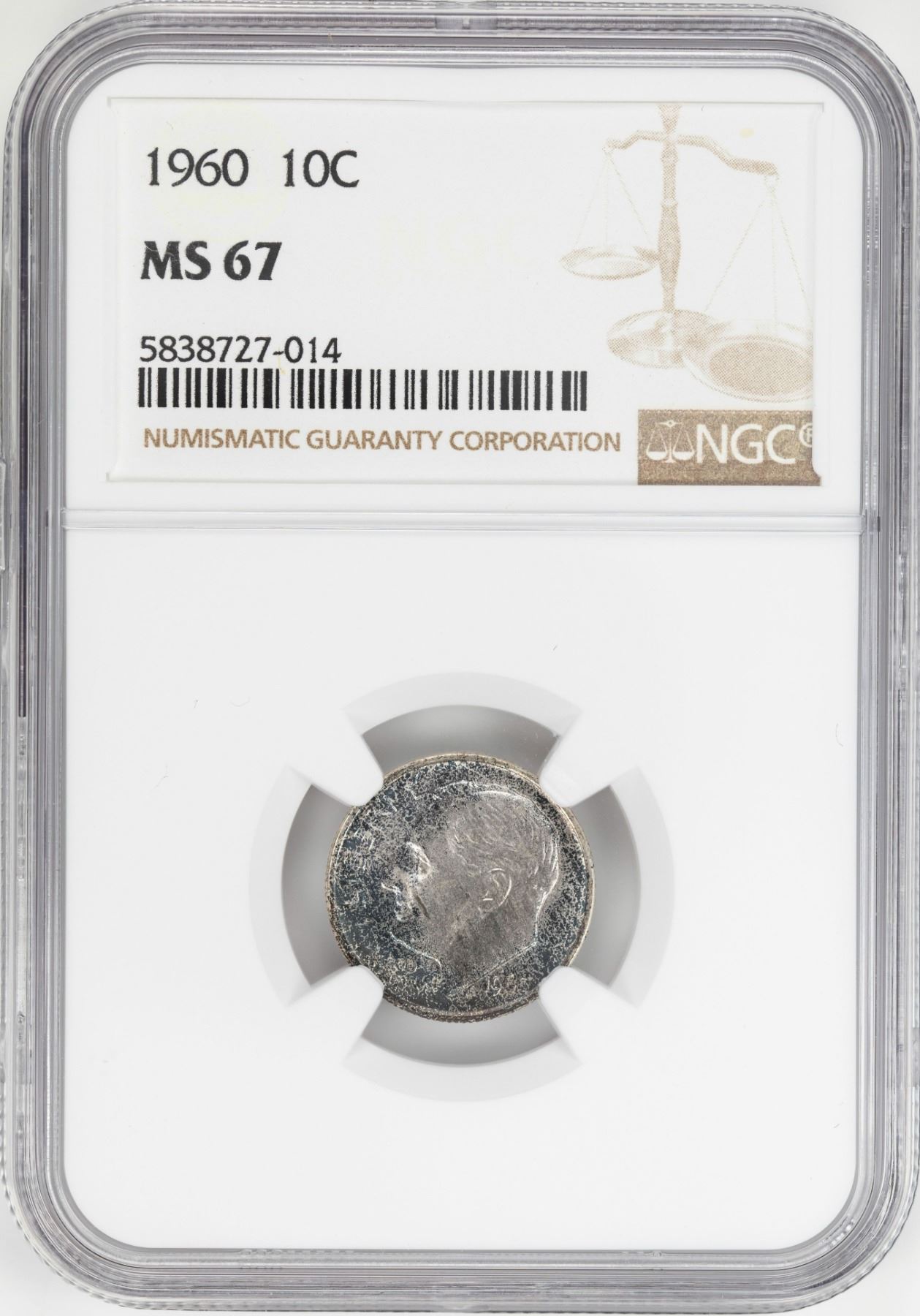 One 1960 Roosevelt Dime Coin NGC MS67.