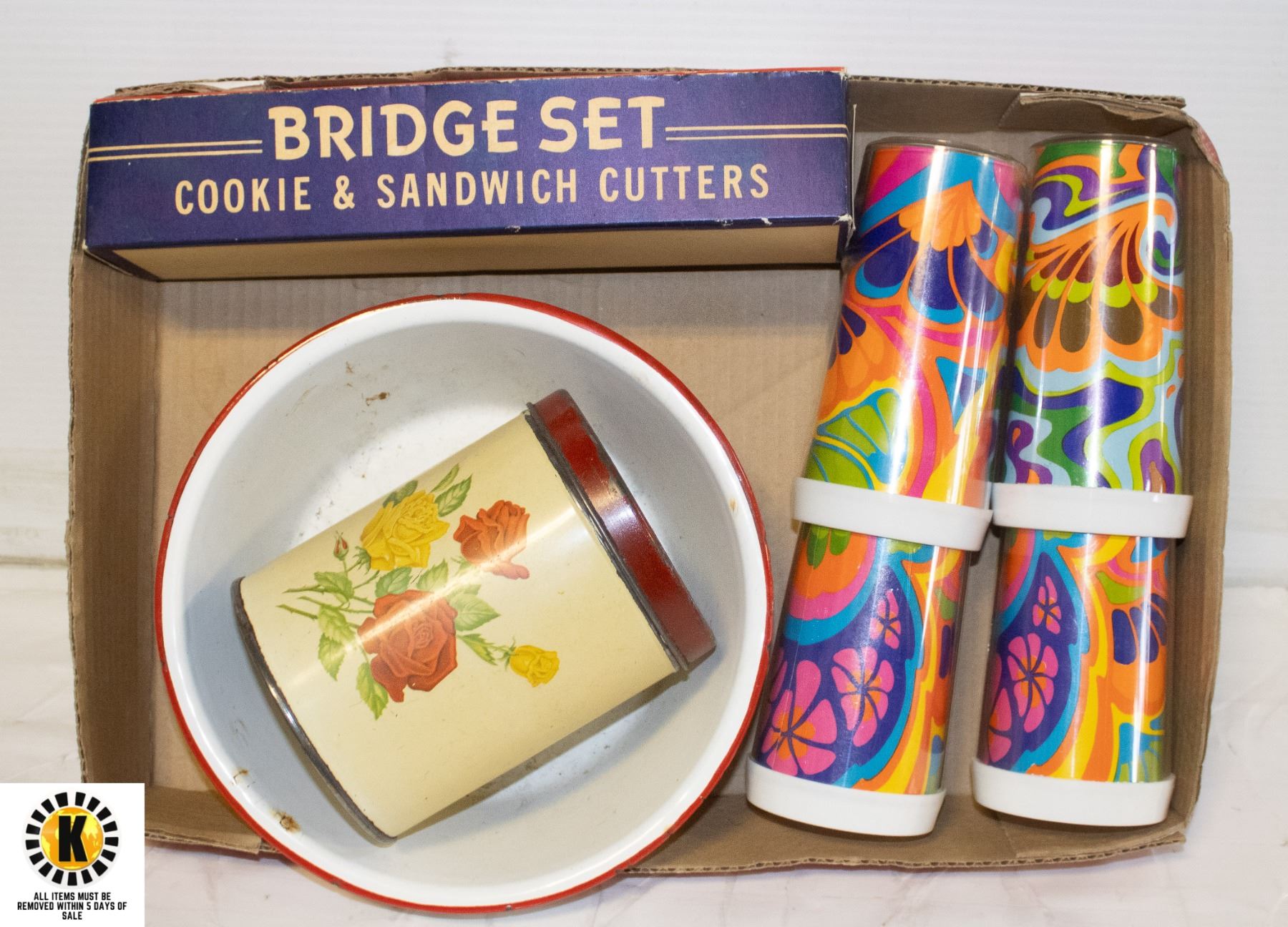 1960'S CUPS, COOKIE SANDWICH CUTTERS, ENAMEL