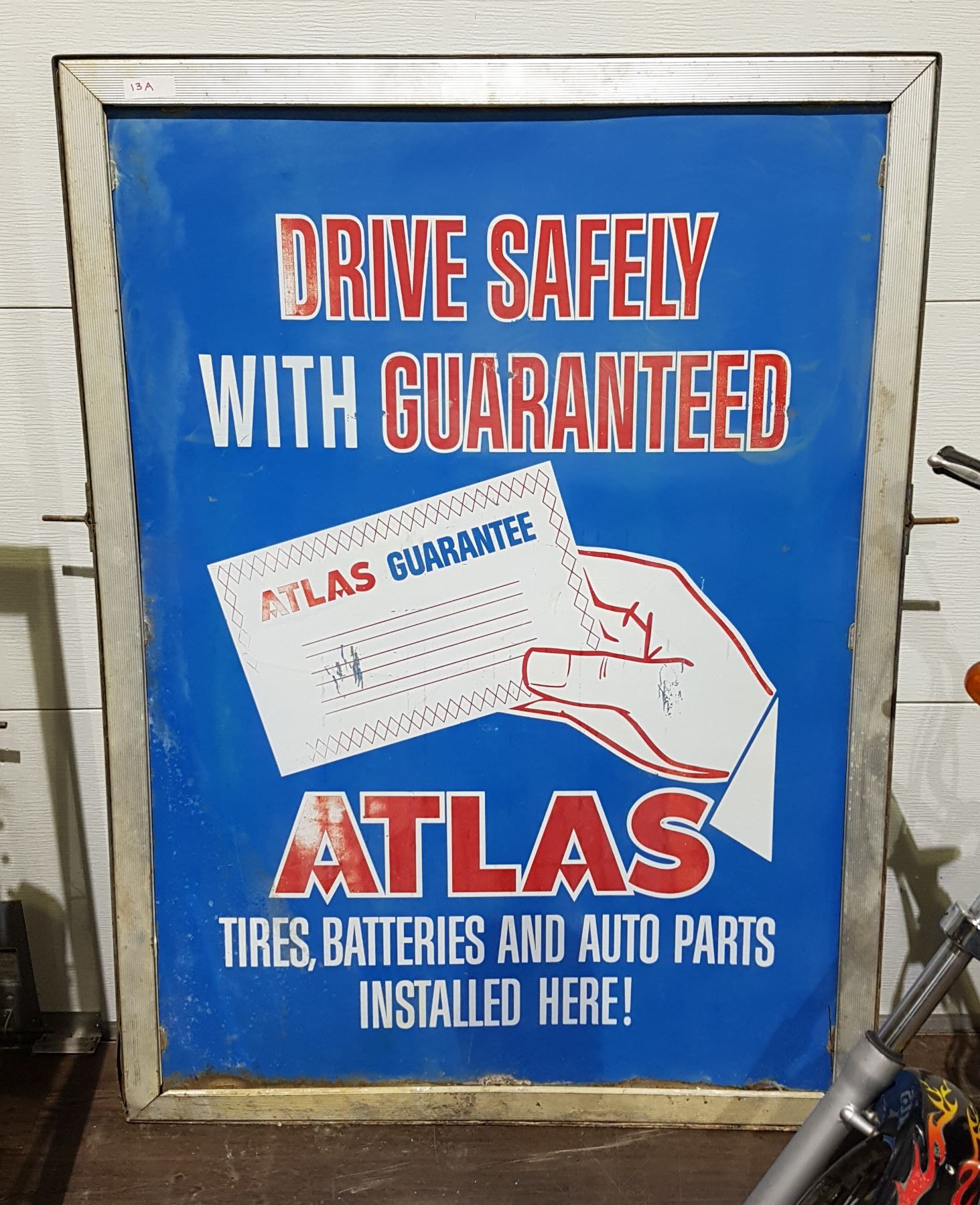 ATLAS WAS ESSO'S PARTS DIVISION. IT'S PAINTED METAL IN ORIGINAL FRAME. APPROX 45" X 61.5". NO SHIPPING AVAILABLE.