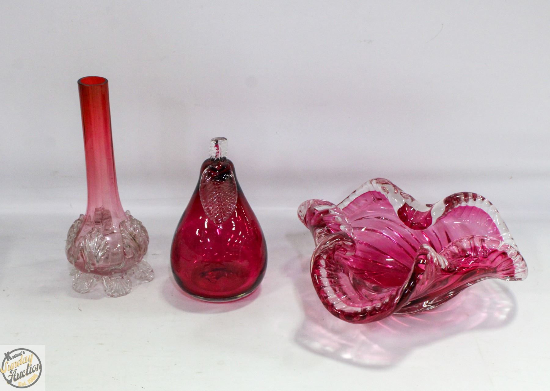 GLASS BOWL SOLD WITH TWO SMALLER CRANBERRY GLASS PIECES **ALL ITEMS MUST BE REMOVED BY 5PM SATURDAY, NOVEMBER 8th 2025. ALL REMAINING ITEMS WILL BE SUBJECT TO A $6.00 PER DAY STORAGE CHARGE. ANY ITEMS REMAINING AFTER MONDAY, NOVEMBER 24TH 2025 WILL BE CONSIDERED FORFEITED. NO REFUNDS WILL BE ISSUED FOR FORFEITED ITEMS. TO SCHEDULE A PICK UP APPOINTMENT CLICK HERE