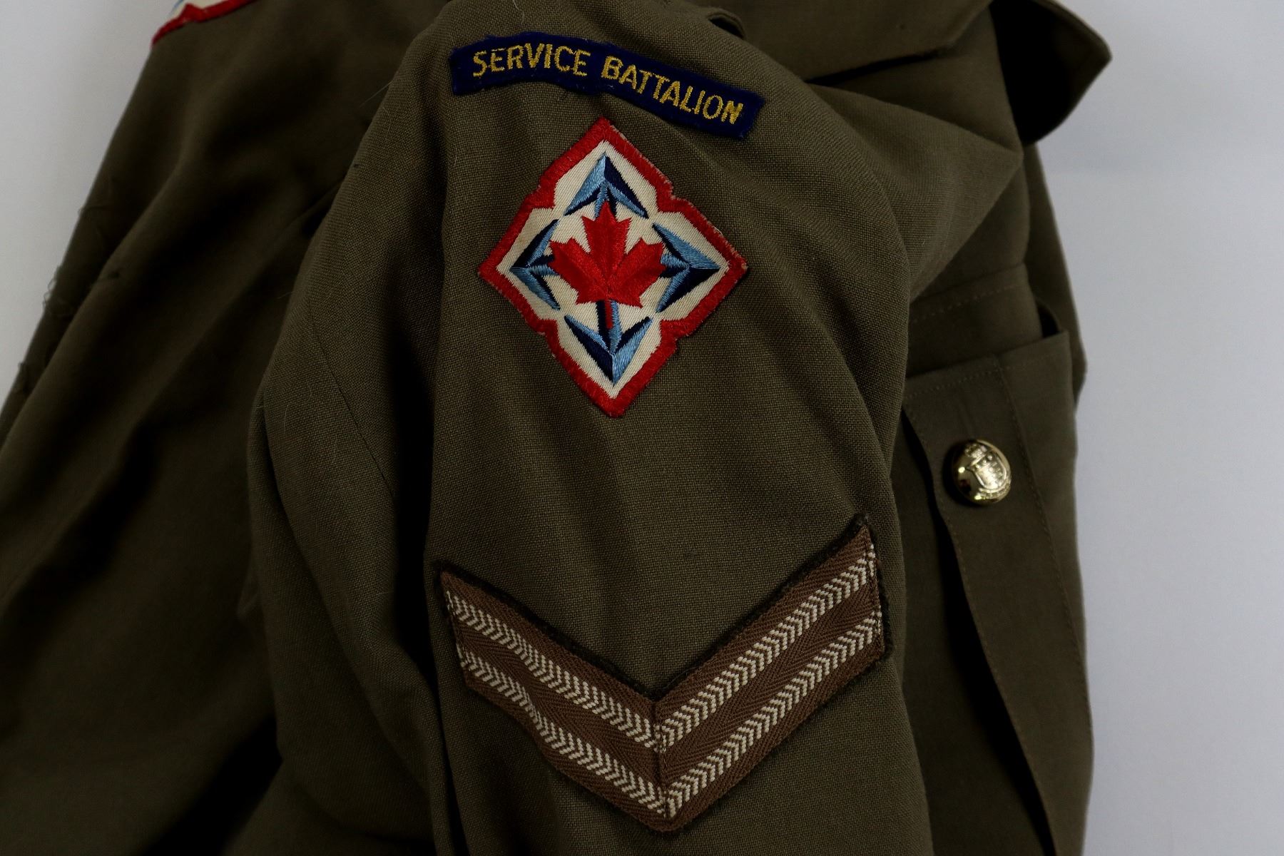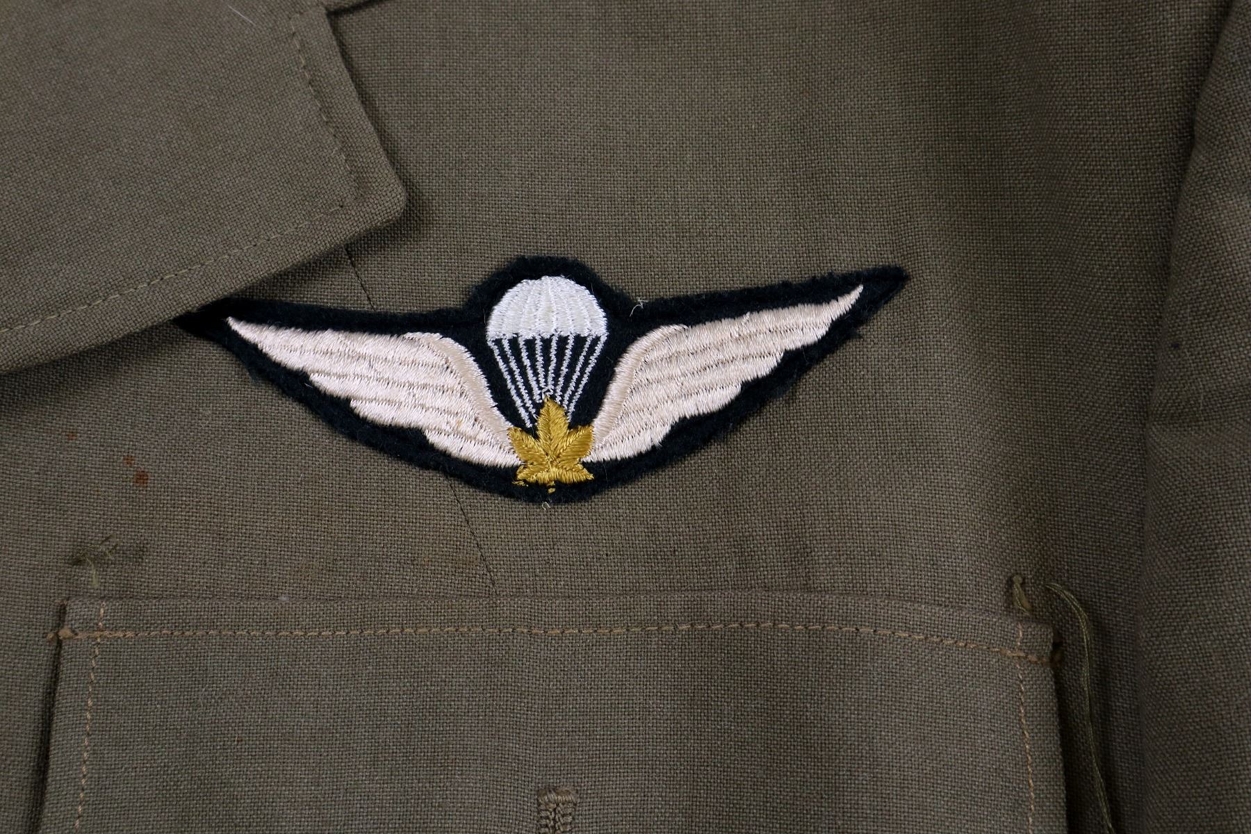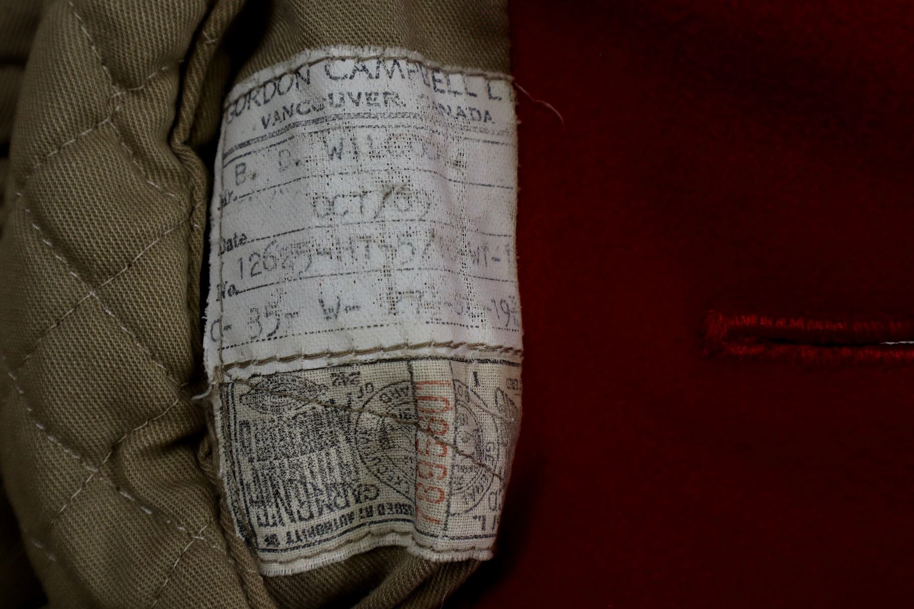 LOT INCLUDES: (1) RCAF CEREMONIAL RED WOOL TUNIC, MARKED: "GORDON CAMPBELL L, VANCOUVER, CANADA, MR. B.D. WILCOCK, DATE OCT/69" ETC. & VARIOUS OTHER FAINT MARKINGS, CLOSED COLLAR, BUTTON FRONT, BRASS QUEEN'S CROWN RCAF BUTTONS, SHOULDER WIDTH APPROX. 16.5" & (1) ROYAL CANADIAN ORDNANCE CORPS KHAKI TUNIC, MARKED: "BOND CLOTHES, COAT: MAN'S SERVICE, DRESS - KHAKI SUMMER, JUNE 1964, 8405-21-109-8155, SIZE N 4, HEIGHT 62.7 TO 65.0, BREAST 39" TO 40" ", SERVICE BATTALION SHOULDER BADGES, MOBILE COMMAND SHOULDER BADGES, CORPORAL RANK CHEVRONS, ACCOUNTING TRADE BADGE, JUMP WINGS BREAST BADGE, BUTTON FRONT, PLASTIC RCOC BUTTONS. SEE PHOTOS.