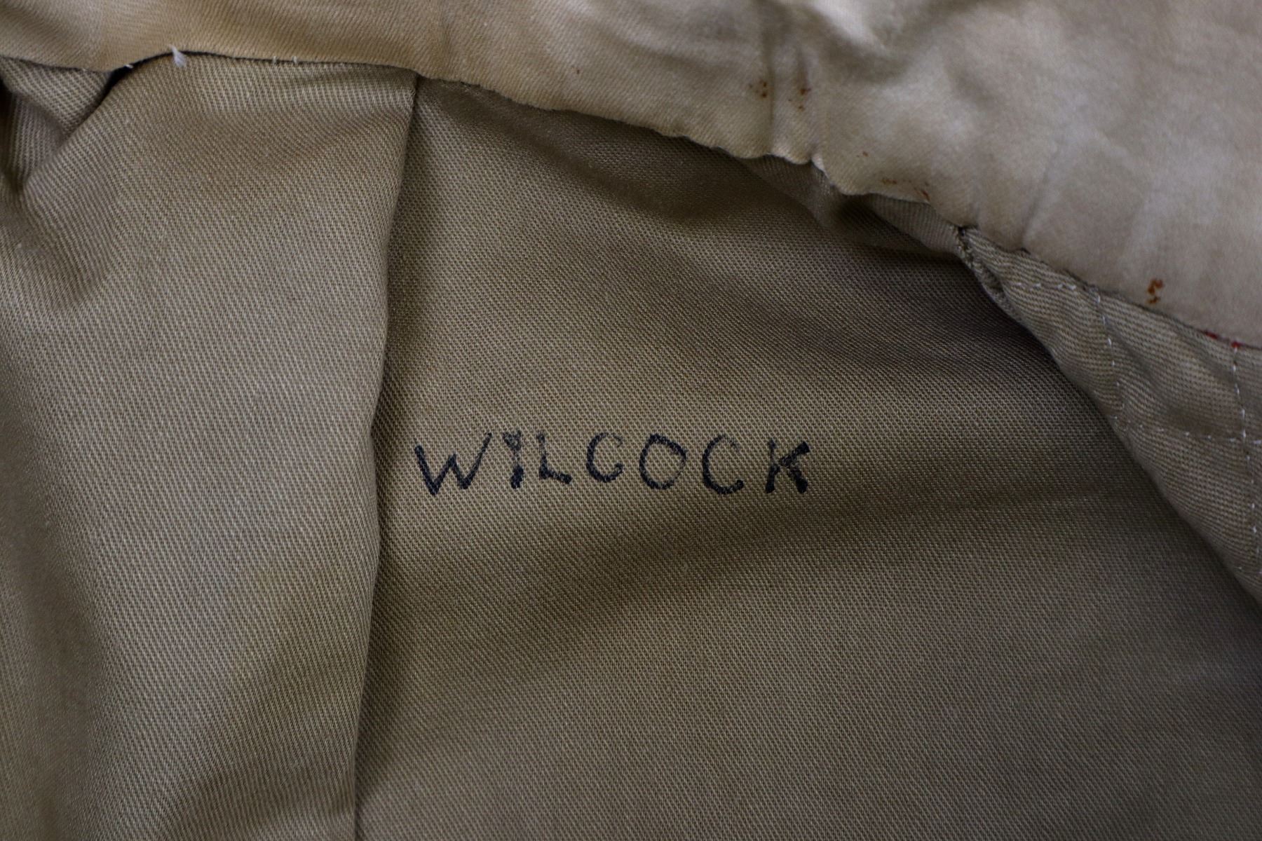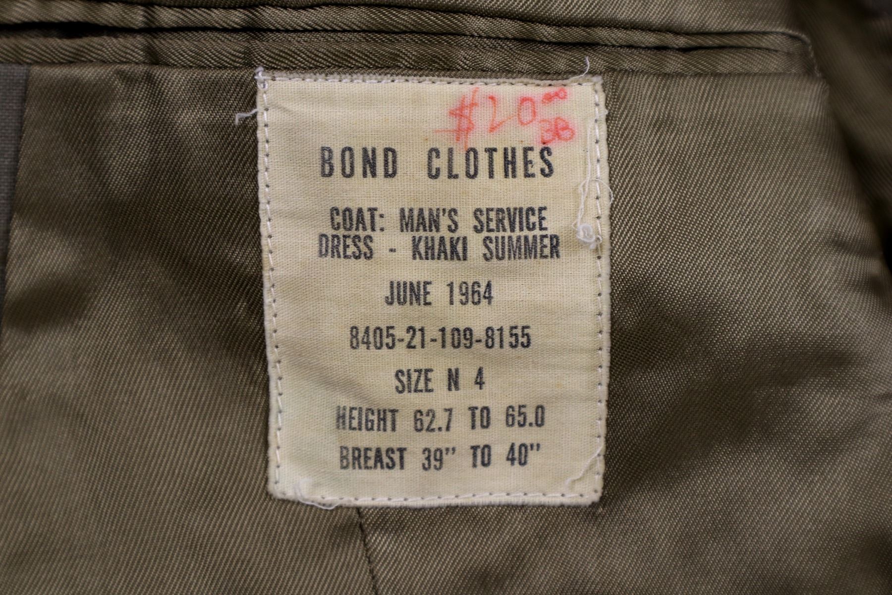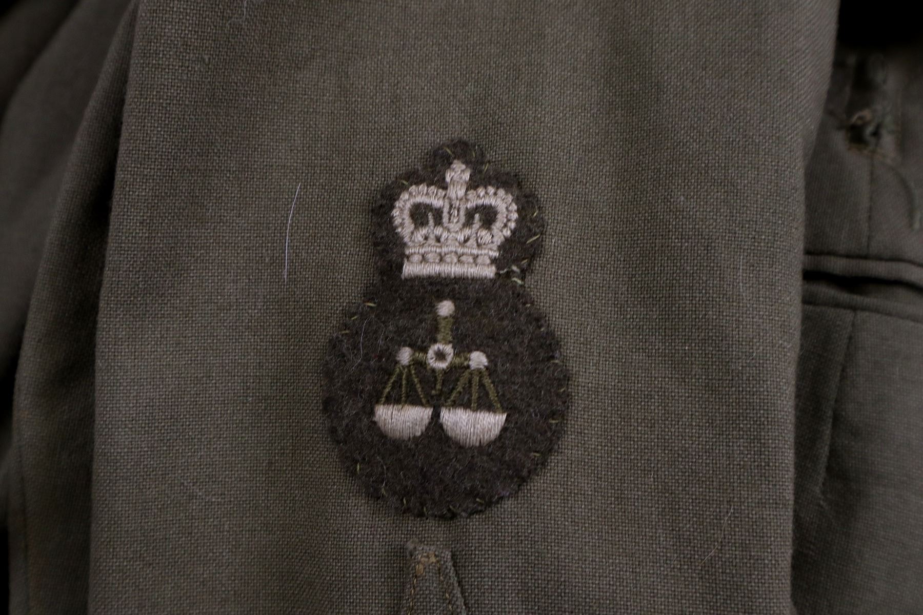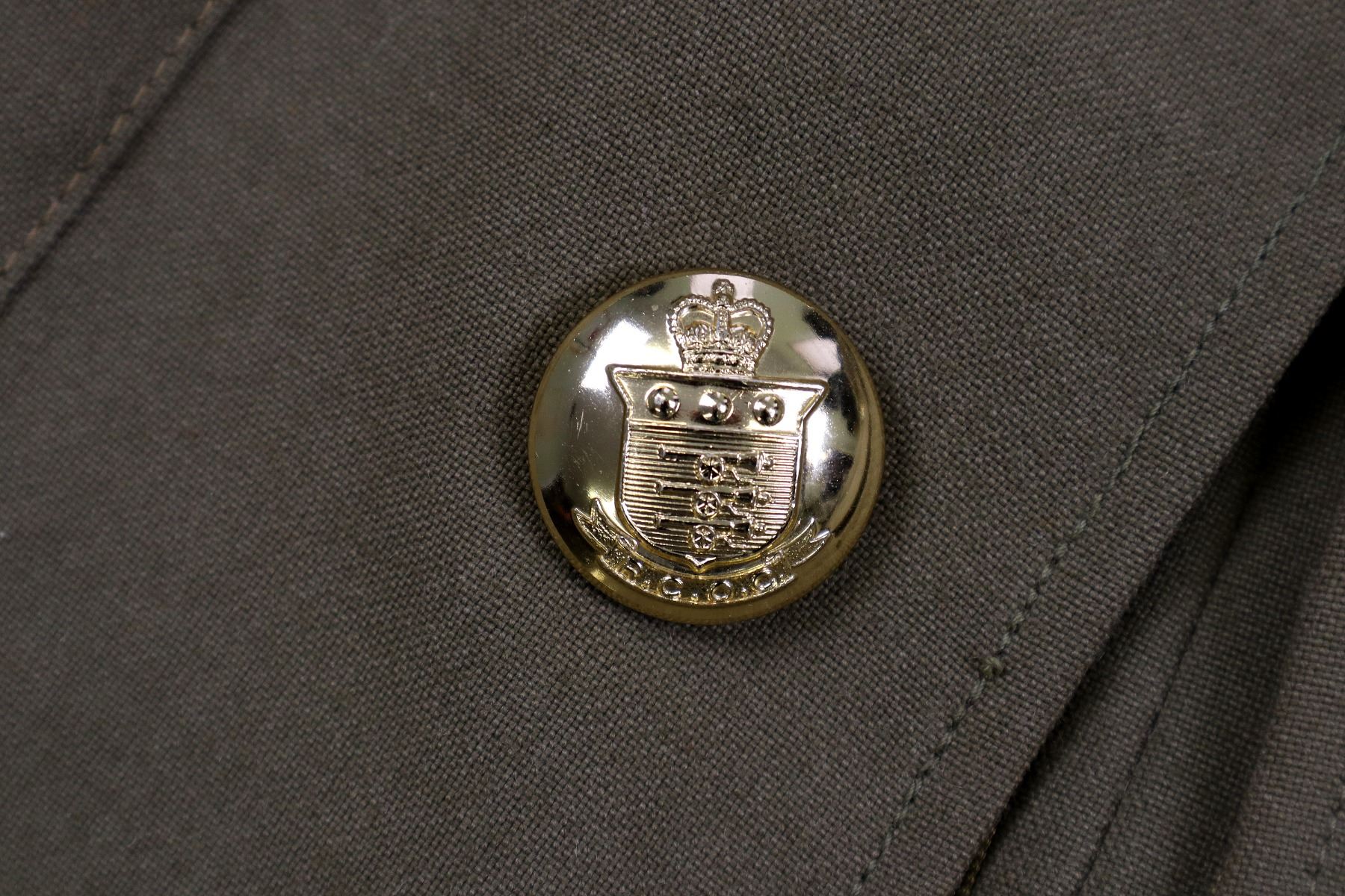 LOT INCLUDES: (1) RCAF CEREMONIAL RED WOOL TUNIC, MARKED: "GORDON CAMPBELL L, VANCOUVER, CANADA, MR. B.D. WILCOCK, DATE OCT/69" ETC. & VARIOUS OTHER FAINT MARKINGS, CLOSED COLLAR, BUTTON FRONT, BRASS QUEEN'S CROWN RCAF BUTTONS, SHOULDER WIDTH APPROX. 16.5" & (1) ROYAL CANADIAN ORDNANCE CORPS KHAKI TUNIC, MARKED: "BOND CLOTHES, COAT: MAN'S SERVICE, DRESS - KHAKI SUMMER, JUNE 1964, 8405-21-109-8155, SIZE N 4, HEIGHT 62.7 TO 65.0, BREAST 39" TO 40" ", SERVICE BATTALION SHOULDER BADGES, MOBILE COMMAND SHOULDER BADGES, CORPORAL RANK CHEVRONS, ACCOUNTING TRADE BADGE, JUMP WINGS BREAST BADGE, BUTTON FRONT, PLASTIC RCOC BUTTONS. SEE PHOTOS.