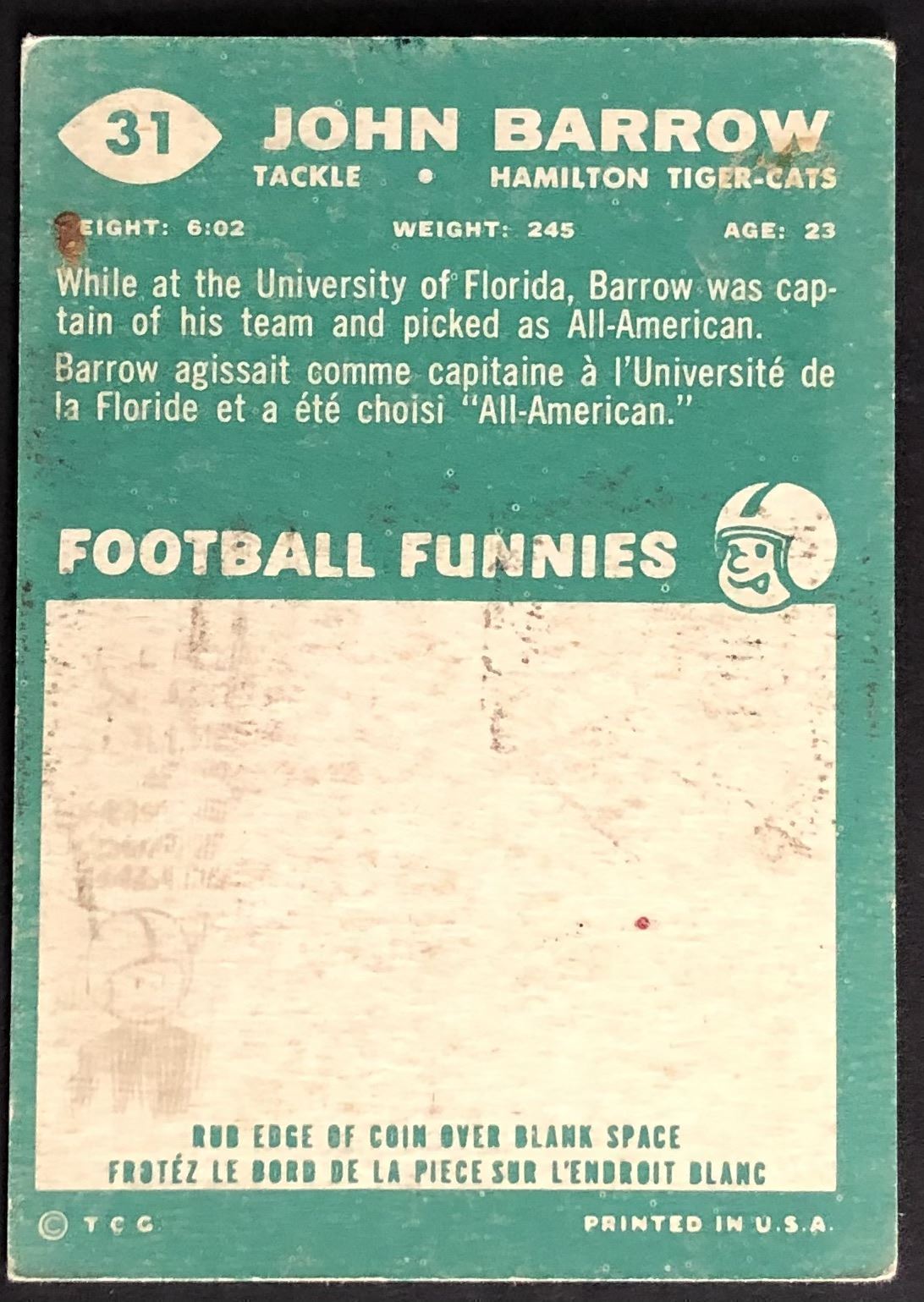 Card #31 CFL, football, vintage, hall of fame