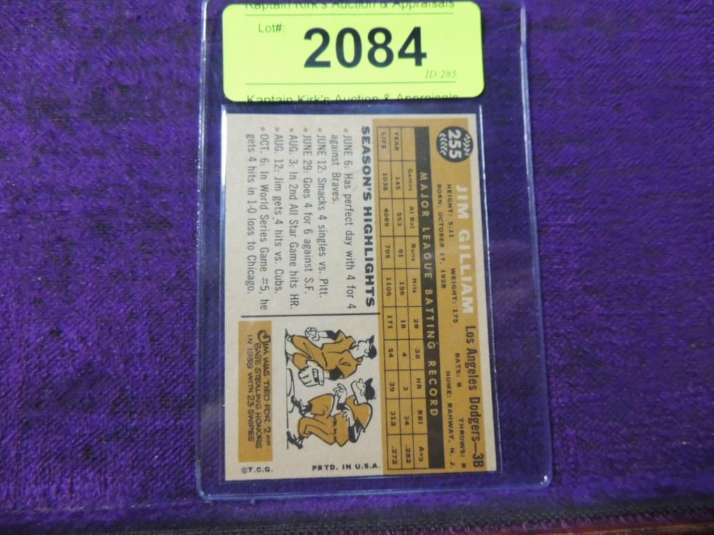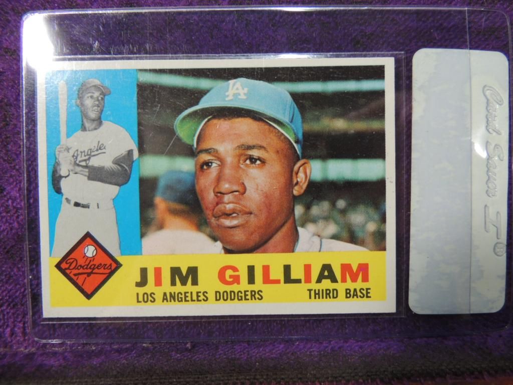 1960 TOPPS JIM GILLIAM #255 BASEBALL CARD. EXCELLENT CONDITION. BASEBALL CARD. TRADING CARD. COLLECTIBLE. VINTAGE CARD. PROTECTIVE PLASTIC SLEEVE. RARE CARD. AS SHOWN. SEE PHOTO FOR MORE DETAILS.