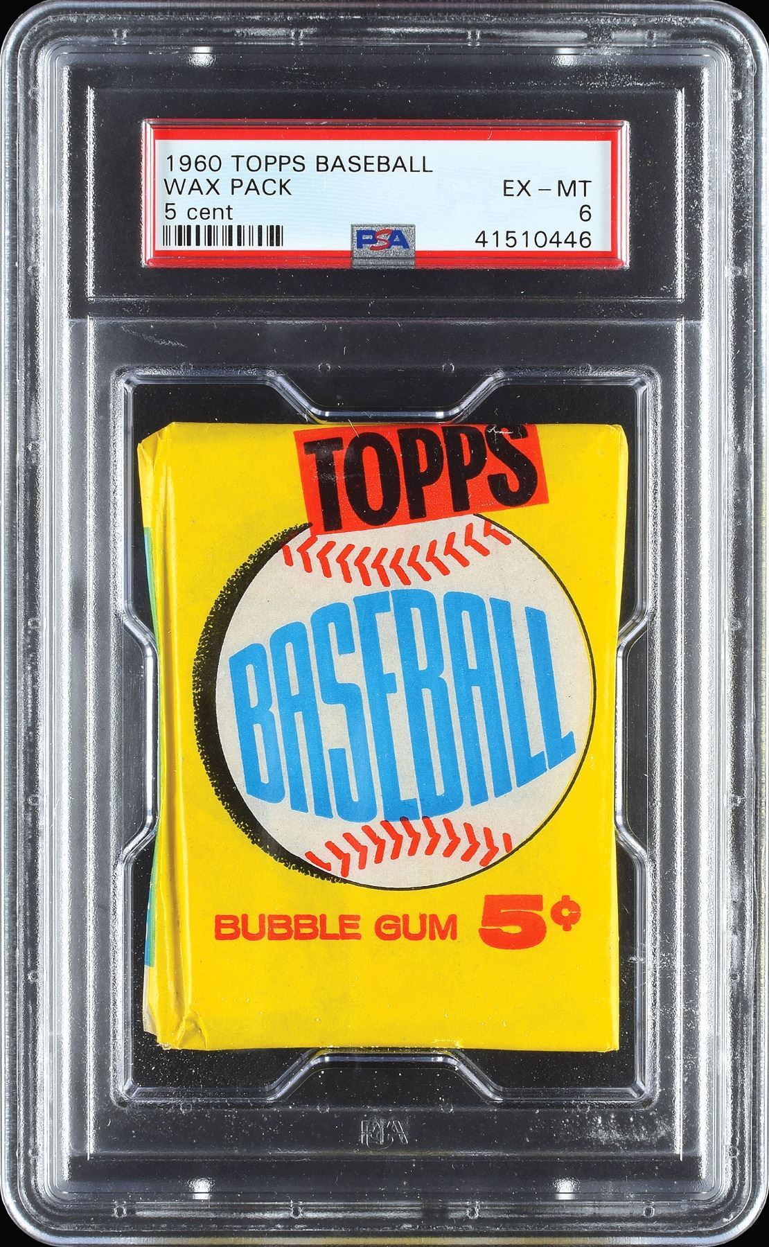 Graded by PSA EX-MT 6. Very clean "NICKEL" pack, tight clean seal with bright color. The larger 5 cent wax pack is significantly tougher, and more desirable, than the standard Penny Packs. Only 57 total wax packs have been authenticated by PSA.