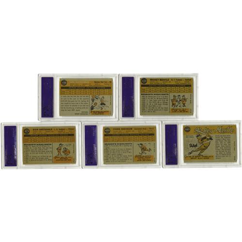 <B>1960 Topps Baseball Complete Set (572).</B></I> In 1960, Topps opted for a horizontal format and again returned to the use of lifetime statistics on the card backs. A run of All-Star cards included in the high series close out the set. A total of five cards have been graded by PSA with an aggregate SMR value of $815. Graded cards - <B>PSA 7</B></I> #148 Yastrzemski, 475 Drysdale, 490 F. Robinson, 563 Mantle AS; <B>PSA 6:</B></I> #350. Ungraded cards include #1 Wynn (EX), 7 Mays/Rigney (EX), 10 Banks (EX/MT), 28 B. Robinson (G), 35 Ford (VG/EX), 50 Kaline (EX), 73 Gibson (EX), 136 Kaat (EX), 160 Mantle/Boyer (VG), 200 Mays (EX), 250 Musial (EX), 300 Aaron (EX), 316 McCovey (EX), 326 Clemente (VG), 332 Yankees (EX/MT), 377 Maris (EX), 420 Mathews (EX), 445 Spahn (EX), 480 Berra (EX/MT), 493 Snider (EX), 554 McCovey AS (EX), 560 Banks AS (EX), 561 Kaline AS (EX/MT), 564 Mays AS (EX), 565 Maris AS (EX/MT), 566 Aaron AS (EX/MT) and 570 Drysdale AS (EX). Grades 17% NM to NM/MT, 72% EX to EX/MT, 11% VG to VG/EX.