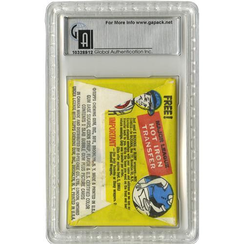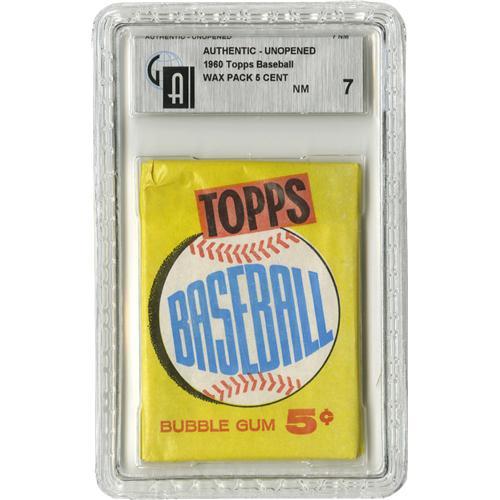 <B>1960 Topps Baseball Wax Pack GAI NM 7.</B></I> The canary yellow glow should bring back fond memories for those among us who cracked these open as kids. Who knows what superstar sluggers or heroic hurlers might have spent the last forty-six years resting inside? Vibrant colors and a tight seal earn this one top marks. Slabbed by GAI for protection and assurance that there has been no tampering with the original seal. <BR><BR><B>Important notice:</B> Heritage usually auctions material at the rate of 200-250 lots per hour. On some occasions eBay Live bid software or the Internet may not be able to keep up with the pace of the auction. We recommend placing a realistic absentee bid now as insurance to avoid disappointment. Occasionally the auctioneer may eliminate or reject an eBay Live bid, and the auctioneer may also reopen a lot after the close of the eBay live bidding (usually because we missed an audience bid), and may reject your bid even if it shows you as the winning bidder. By bidding via eBay Live, you agree that Heritage may award the lot to another bidder at its sole discretion under the circumstances described above or any other reasonable circumstances. Since eBay bids are not shown to us until we open the lot on the floor, we treat those bids just like floor bids. In most cases the floor responds before the eBay bid is presented to us, due to Internet lag time, so for consistency we have made it a policy that floor bids are always considered first over tie eBay live bids. Also please note that all Heritage lots purchased through eBay Live carry a 22.5% Buyer's Premium. Please make sure you read the Terms and Conditions before you bid. This lot is being auctioned in conjunction with a live floor auction by Heritage Galleries & Auctioneers. All final auction and invoice information will be supplied by Heritage Galleries & Auctioneers, and all other information should be considered preliminary. Lot:19586 <BR><BR><B>Winning Notification and Billing:</B> After the FINAL session in this auction is complete, Heritage will send e-mail and snail mail invoices. This process normally takes several days. All final auction and invoice information will be supplied by Heritage Galleries & Auctioneers, and all other information should be considered preliminary. <BR><BR>This auction will be conducted on a live auction floor and over the Internet through eBay Live. If you choose to place an absentee bid, please take a moment to <font color='#0000ff'><u><a href='http://pages.ebay.com/liveauctions/help/before/laabsentee.html'>learn how eBay Live absentee bidding works</a></u></font><font color='#000000'>