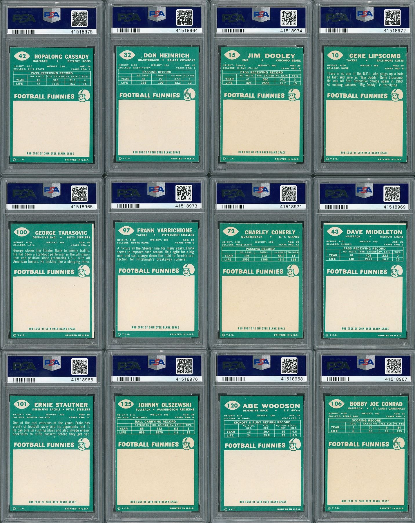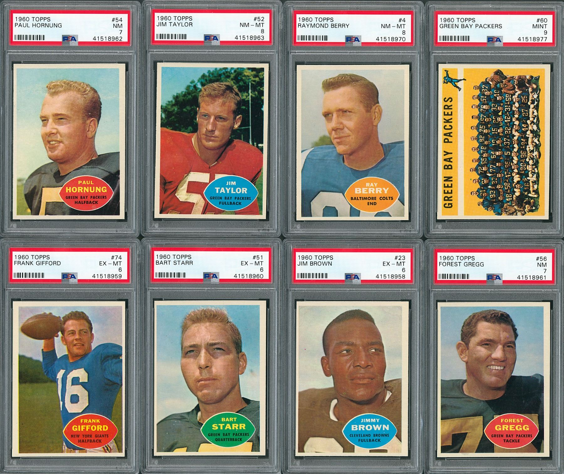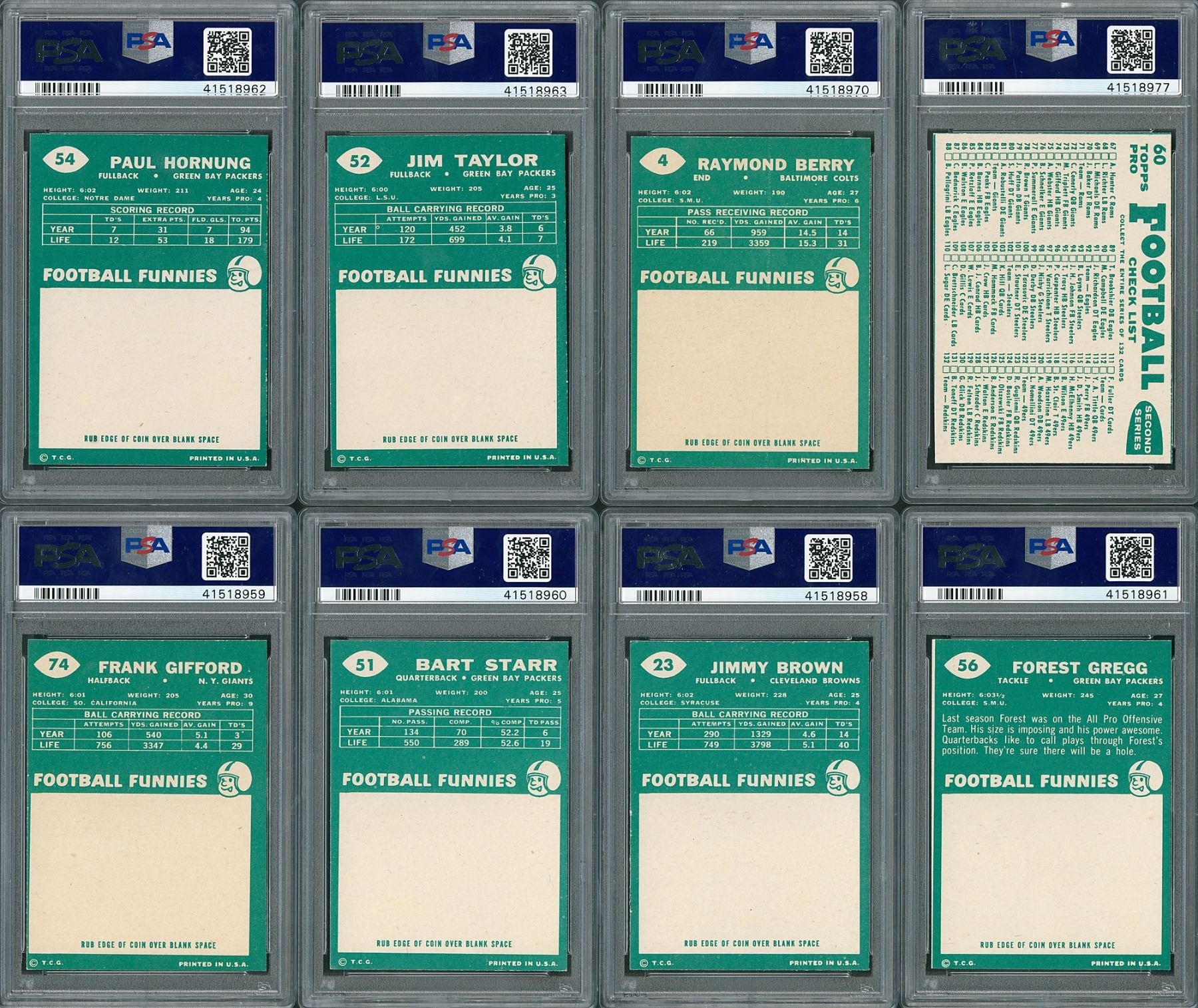 Includes: Graded Cards - PSA MINT 9: 1 card, #60 Packers. PSA NM-MT 8: 13 cards w/ #4 Berry, 10, 15, 32, 42, 43, 52 Taylor, 72 Conerly, 97, 100, 106, 120 and 125. PSA NM 7: 3 cards w/ #54 Hornung, 56 Gregg and 101 Stautner. PSA EX-MT 6: 3 cards w/ #23 Brown, 51 Starr and 74 Gifford.