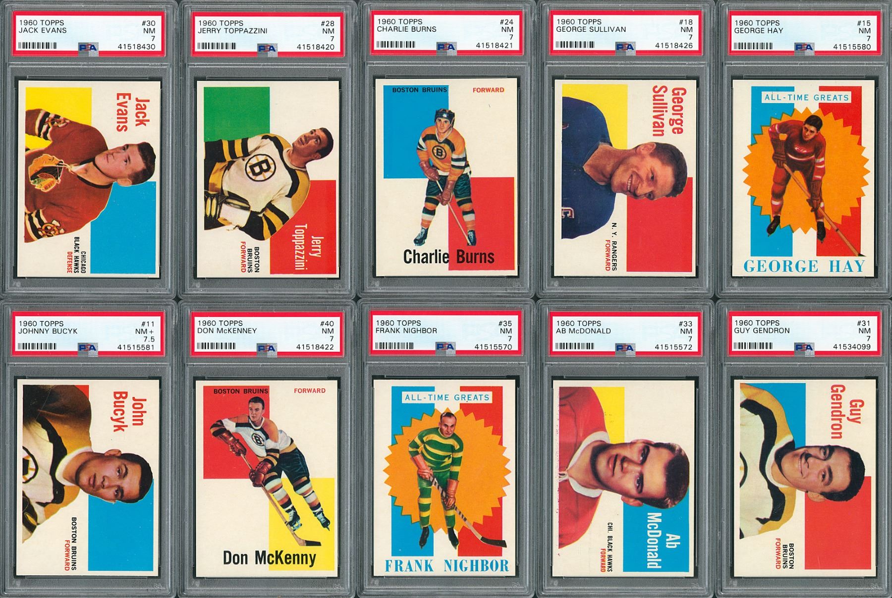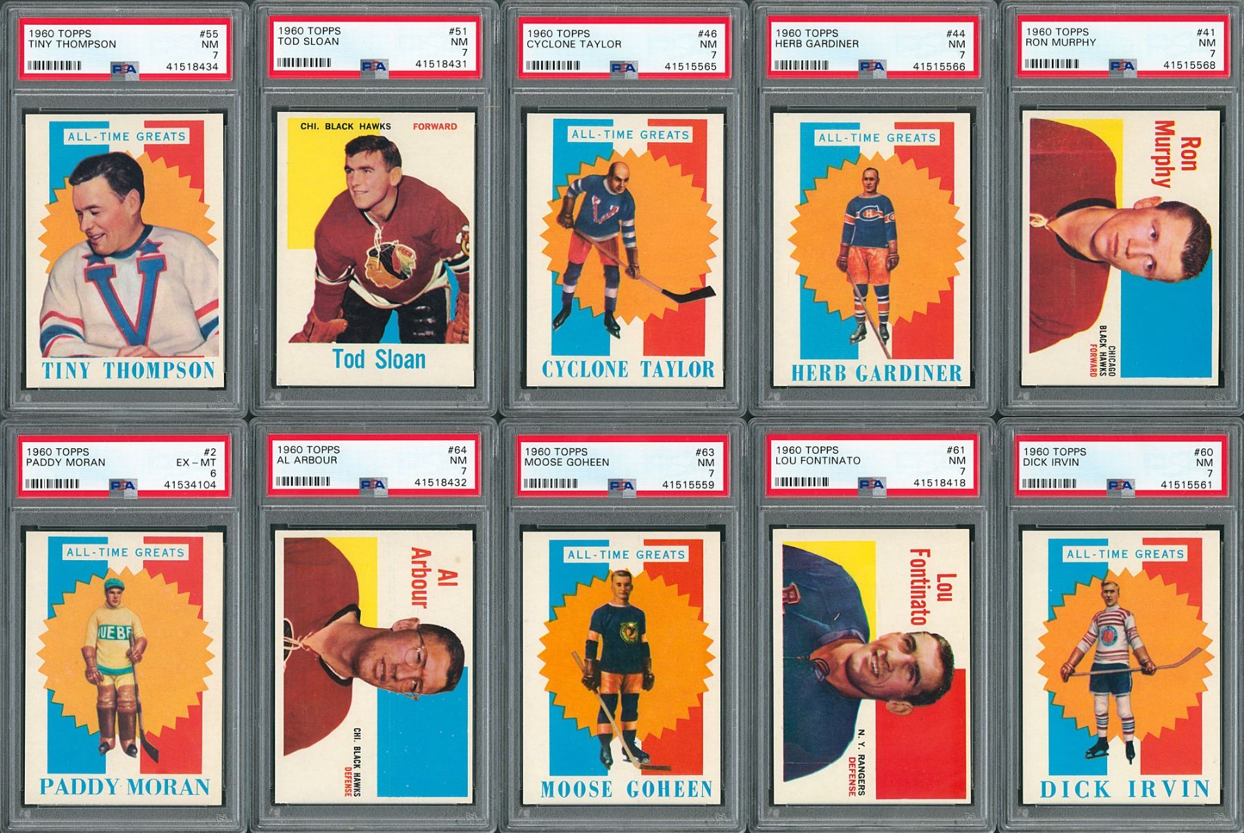 PSA NM 7: 21 cards w/ #1 Patrick, 15, 18, 24, 28, 30, 31, 33, 35, 40, 41, 44, 46, 51, 55, 58 Hull, 59 Morenz, 60, 61, 63 and 64 Arbour.