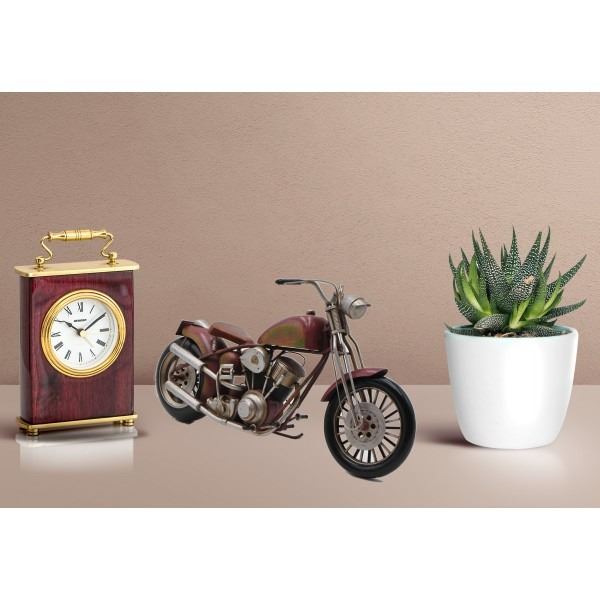 Decorate for Any Table, Desk, Or Shelf In Sporty Fashion With Rustic Iron 1960s Harley Davidson Chopper Metal Motorcycle Sculpture. Featuring A Rustic Iron Frame, This Charming Vintage Motorcycle Includes Detailed Craftsmanship. The Brown Metal Seat and Handlebars are Finished in Natural Colors. Dimensions: approx (H X W): 8X12 Inches.