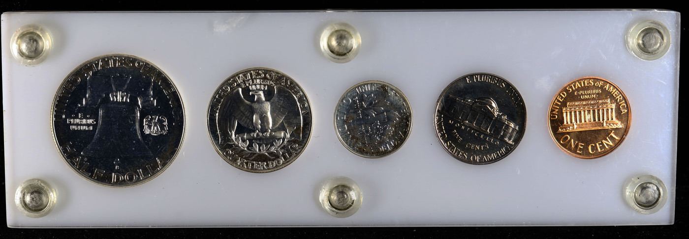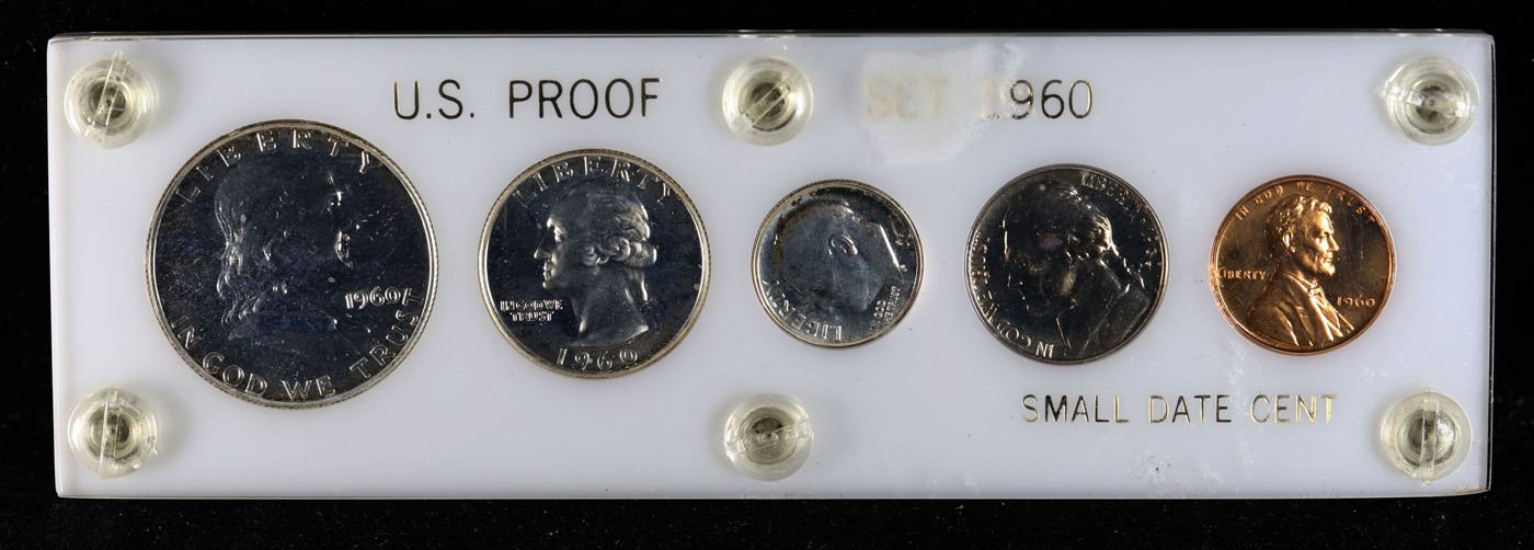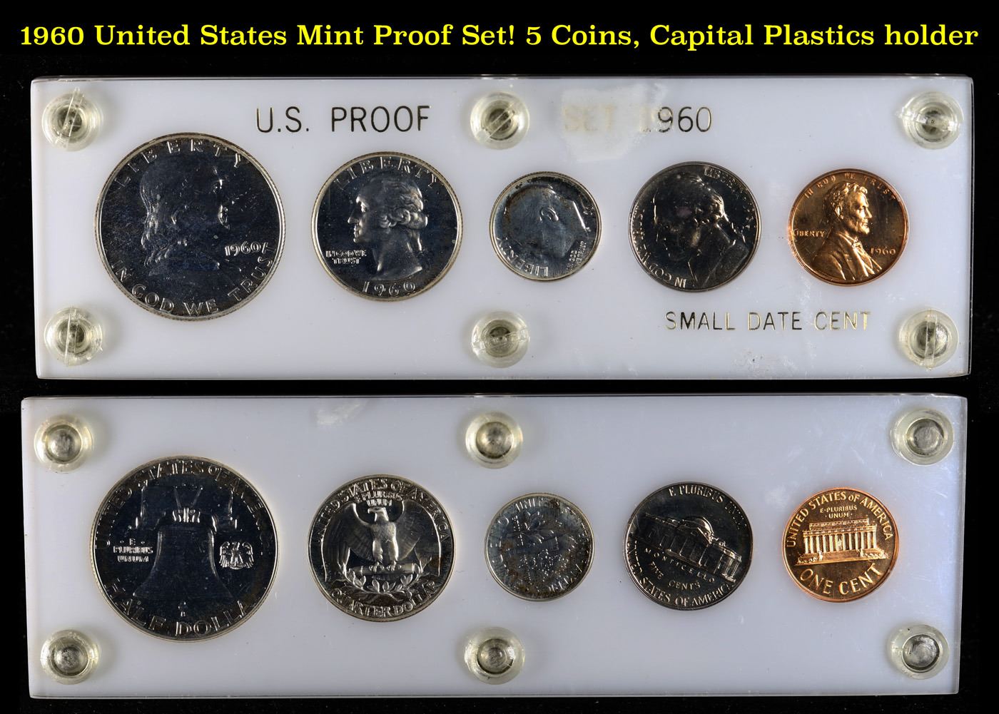 1960 United States Mint Proof Set! 5 Coins, Capital Plastics holder . Up for Auction is a 1960 Proof Set In a Capital Plastics Holder. The set contains a silver proof Franklin Half Dollar, A silver proof Washington Quarter, A silver proof Roosevelt Dime, a Jefferson nickel, and a Licoln penny
