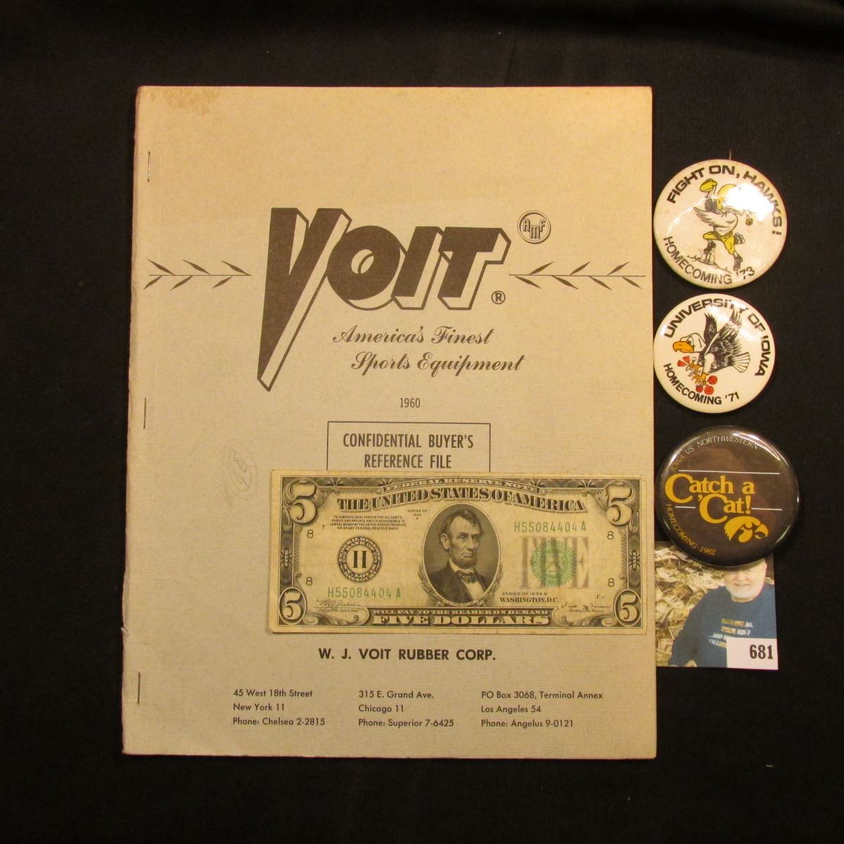 1960 "Voit America's Finest Sports Equipment" catalog; Series 1934B $5 F.R.N. VF; & (3) different 1971-82 Iowa Hawkeye Pinbacks.
