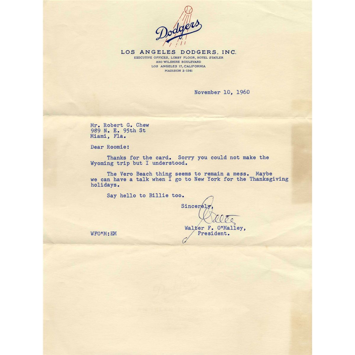 Typed letter signed by Hall of Fame coach Walter O'Malley on ''Los Angeles Dodgers, Inc.'' letterhead, dated 10 November 1960. O'Malley - the baseball owner both vilified and lauded for bringing baseball to California - writes to his friend, Dogers Pilot Robert Chew, in part, ''...The Vero Beach thing [Dodgertown] seems to remain a mess. Maybe we can have a talk when I go to New York...'' Signed ''Walter''. Expected folds from mailing and some toning. Near fine condition.