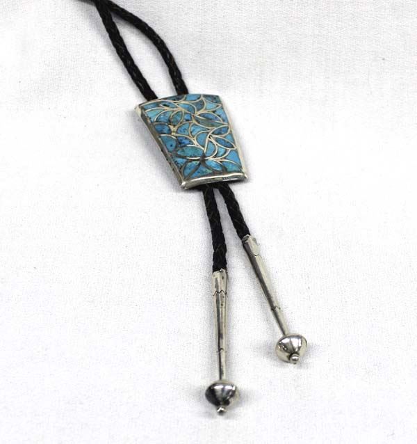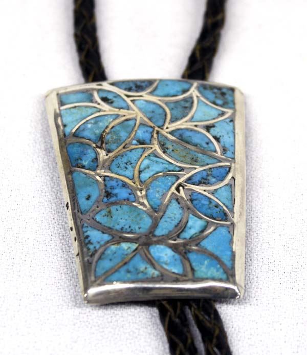 Beautiful 1960's Native American Zuni Sterling Silver Channel Inlay Turquoise Bolo Tie, fish scale pattern, bolo measures 2''L x 1.5''W, leather tie measures 38''L, aglets measure 2.25''L, 37g in total wt.