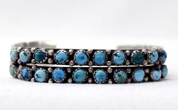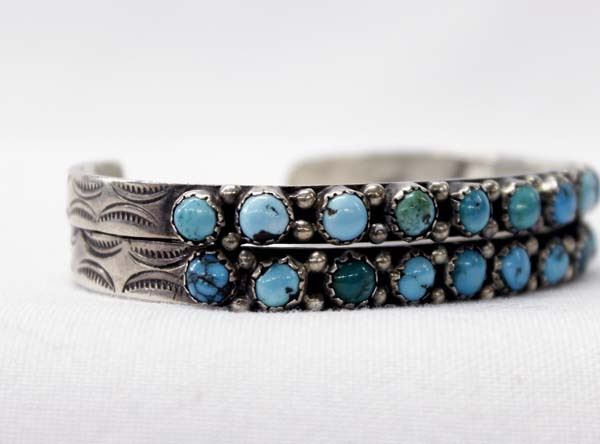 1960 Native American Zuni Sterling Silver Turquoise Bracelet, vintage all sterling silver set with natural turquoise cabochons, inside measures 6'' which includes opening x .5'', 36.8g in total wt.