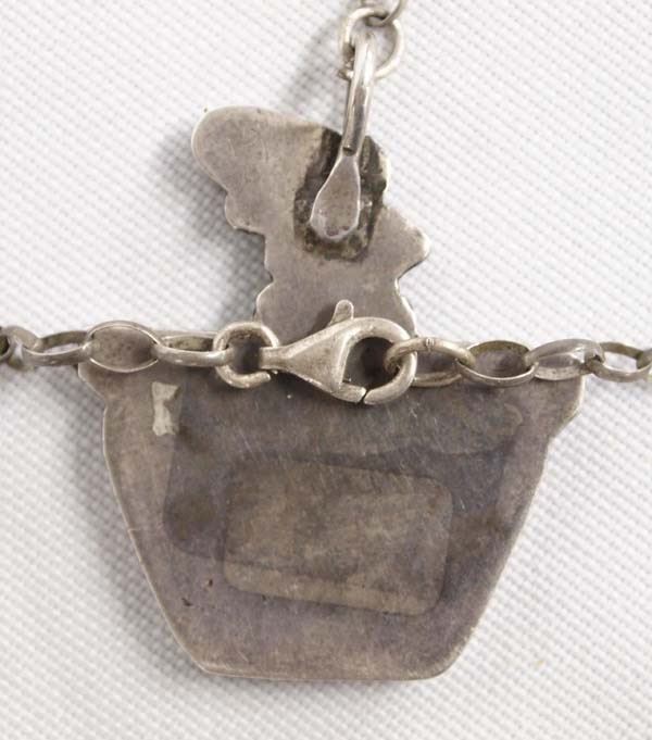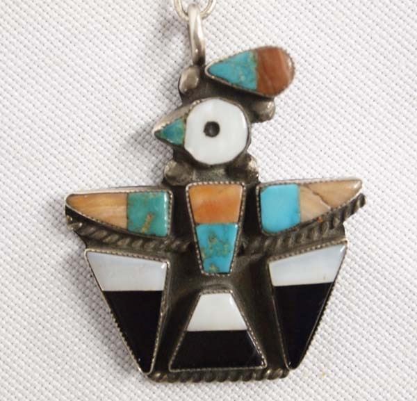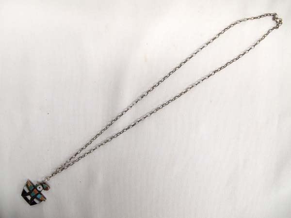 1960 Native American Zuni Traditional Overlay Thunderbird Necklace, pendant measures 1.75'' x 1.25'', beautiful hand wrought chain measures 25'' end to end, 11.2g in total wt.