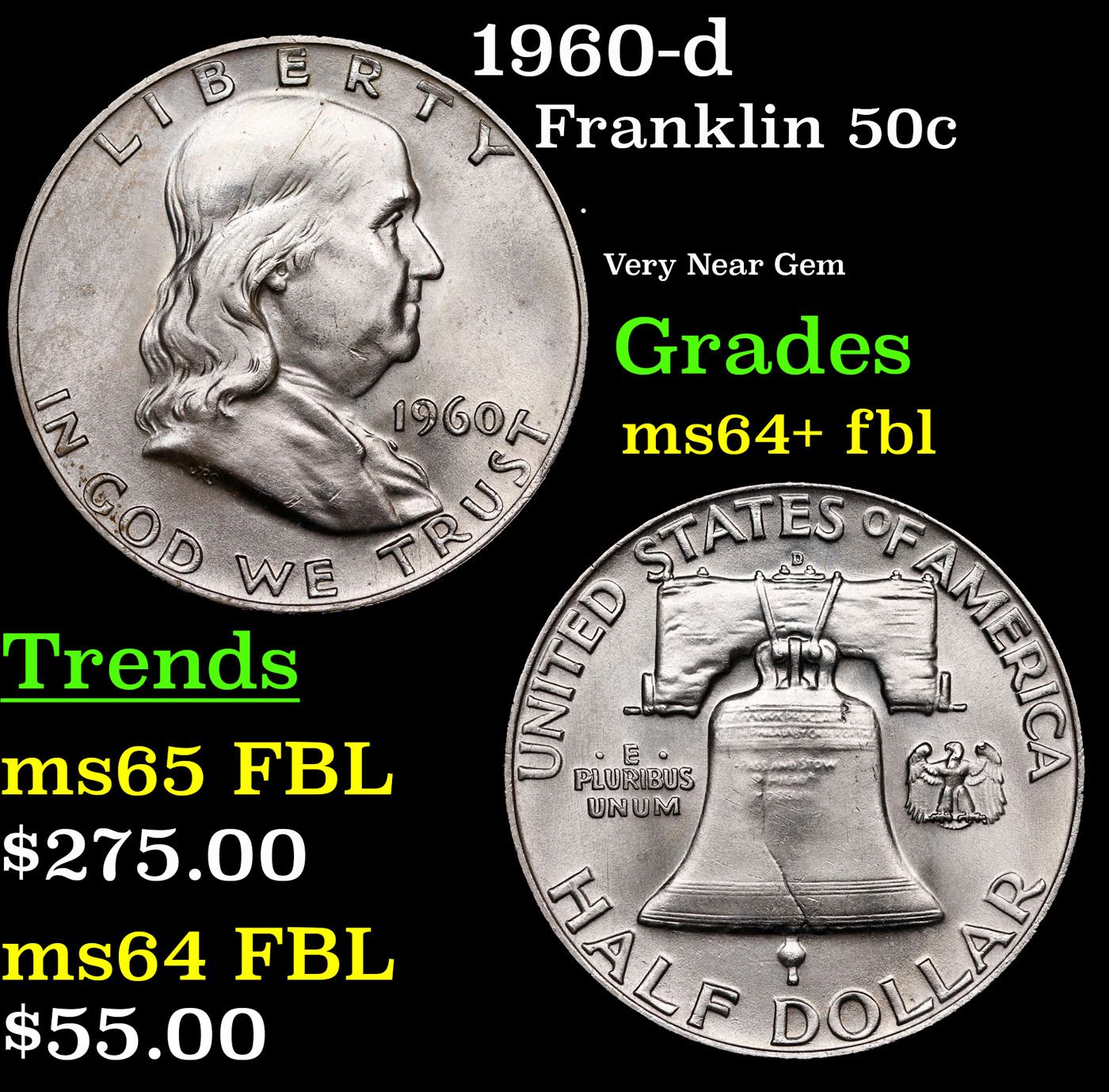 1960-d Franklin Half Dollar 50c Grades Choice Unc+ FBL.