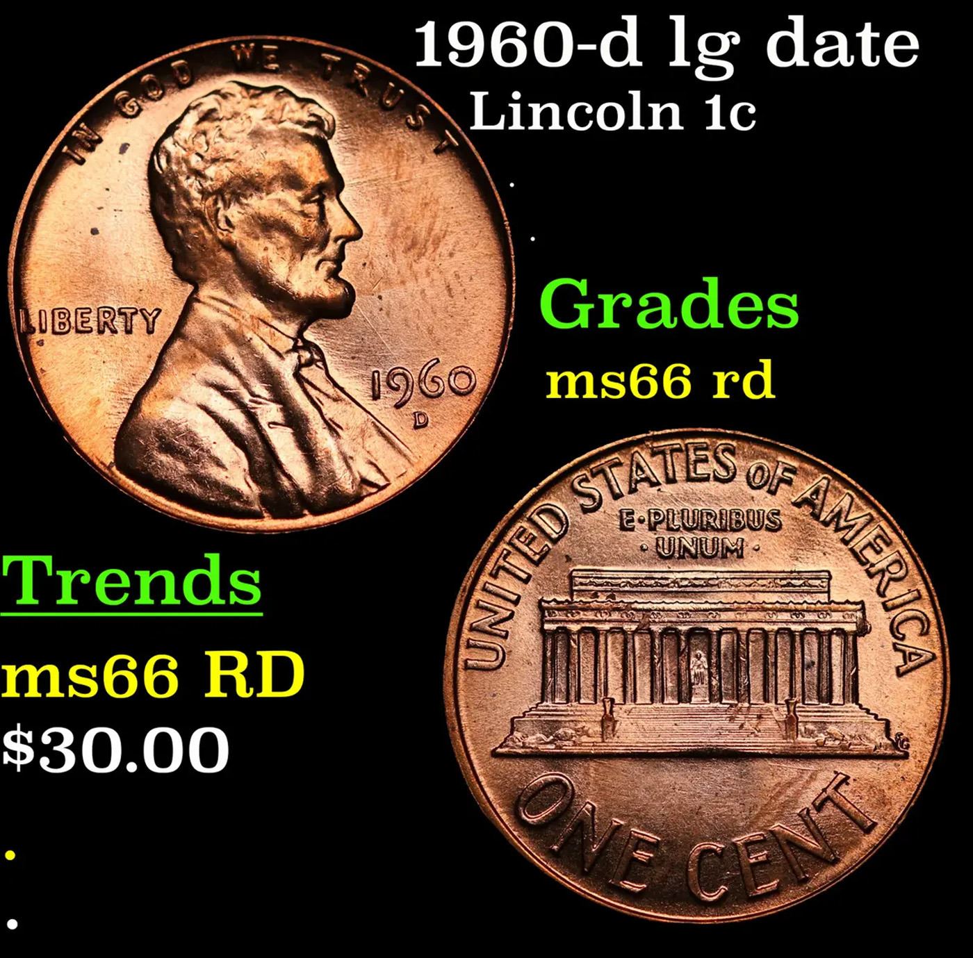 1960-d lg date Lincoln Cent 1c Grades GEM+ Unc RD.