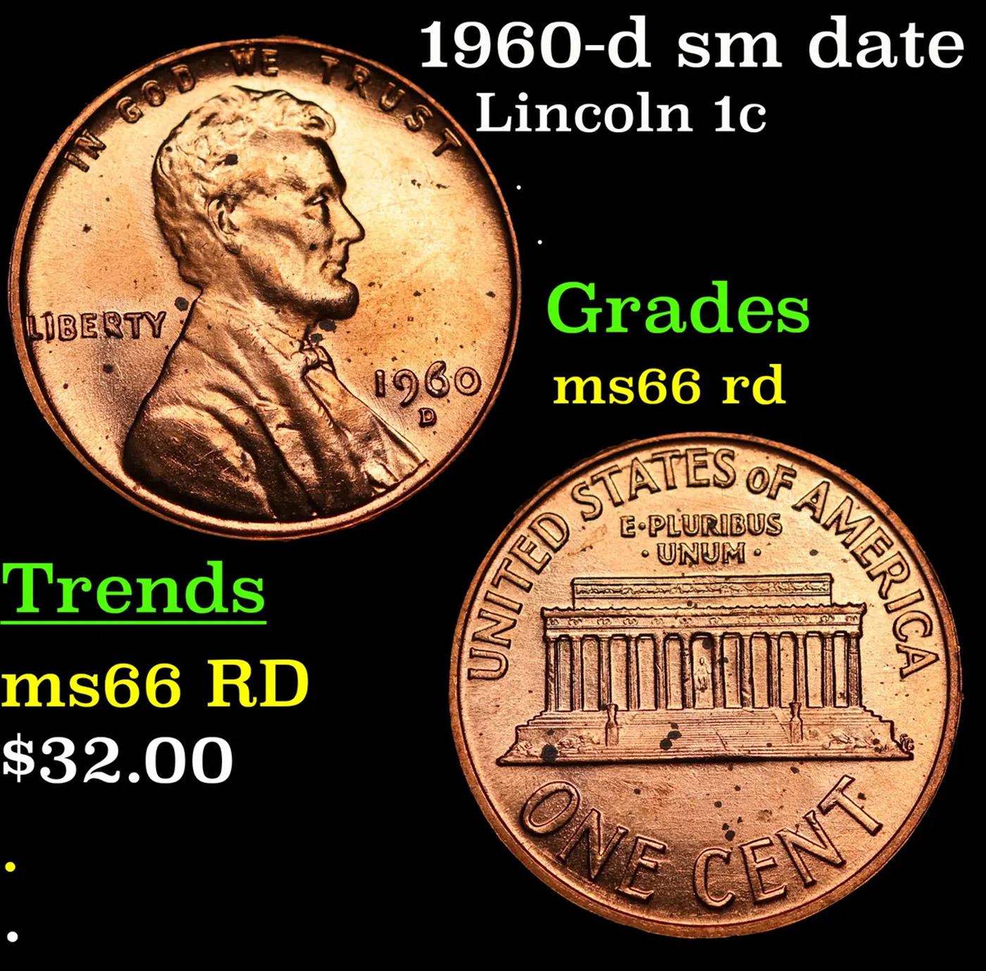 1960-d sm date Lincoln Cent 1c Grades GEM+ Unc RD.