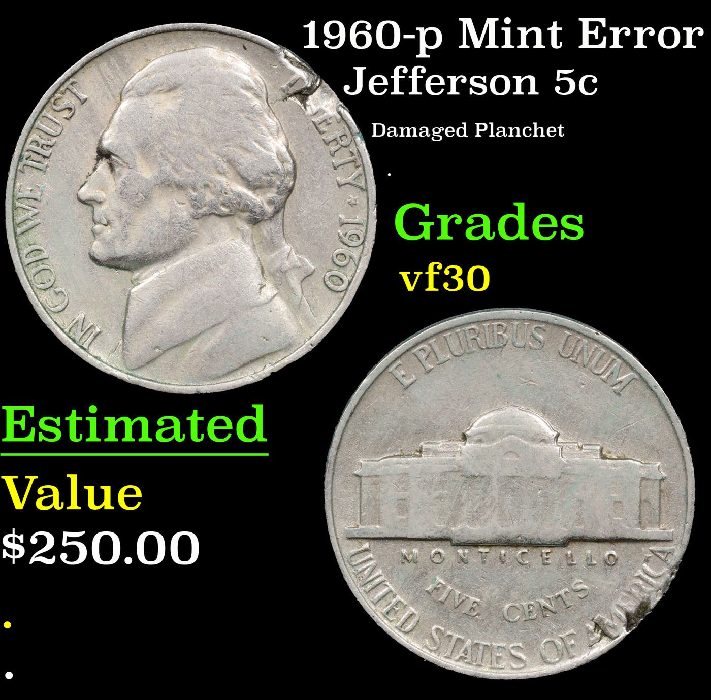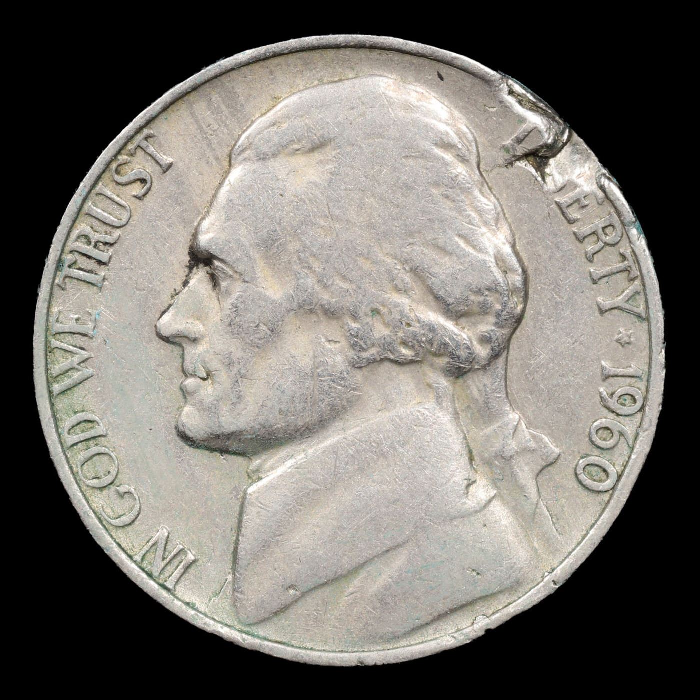 1960-p Mint Error Jefferson Nickel 5c Grades vf++.