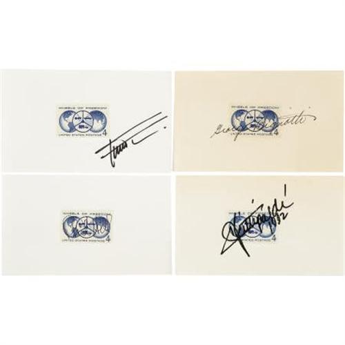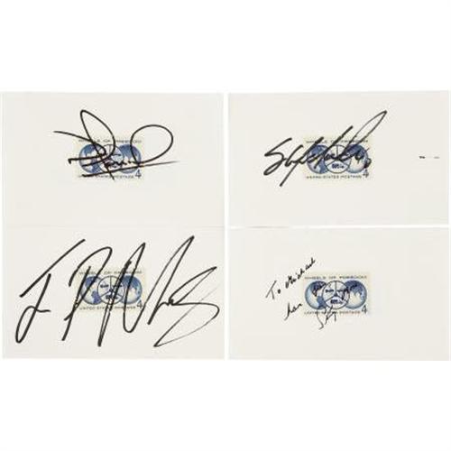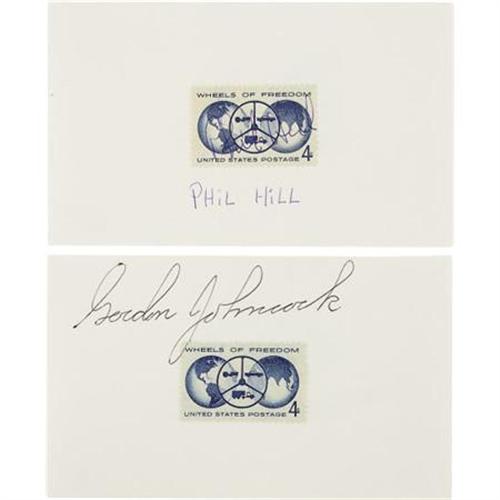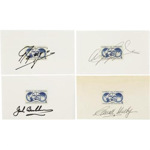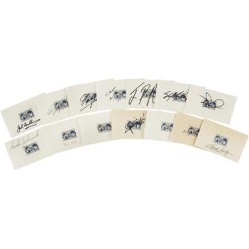 <B>1960's-2000's Formula One Drivers Signed Index Cards Lot of 16.</B></I> Nerves of steel and feet of lead are the common themes of this autograph collection celebrating the best and brightest of the Formula One circuit. Unless otherwise noted, the autographs rate 9/10 or better, and are applied to blank 3x5" index cards either near or over "Wheels of Freedom" 1960 US postage stamps. Featured are: Bignotti, Brabham (one index card, one picture postcard), DeFerren, Fangio, Fittipaldi, Hill (2), Johncock, Luyendyk, Mansell, Martin, Montoya, Moss (one index card personalized to "Michael," one typed letter), Shelby. All pieces are free of creases, tears or other condition concerns. <I>LOA from PSA/DNA. LOA from James Spence Authentication.</B></I><BR><BR><b>Shipping:</b> Flat Material, Small (<a target="_blank" href="http://www.heritageauctions.com/common/shipping.php">view shipping information</a>)