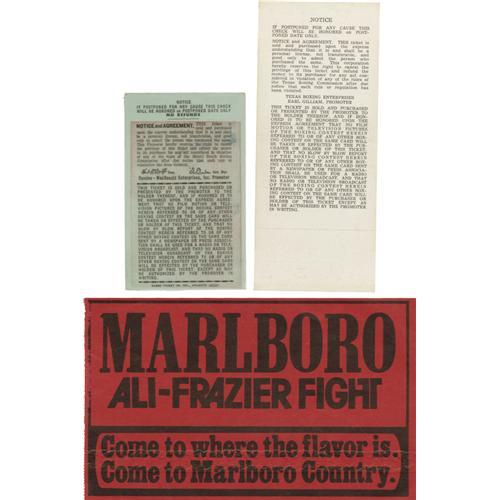 <B>1960's-70's Muhammad Ali/Cassius Clay Fight Tickets Lot Of 3.</B></I> Here is a fantastic lot including three of Muhammad Ali's most notable fights. The first is a stubless ticket to his first fight with Sonny Liston on February 25, 1964 in which he won his first title (EX). The second is a full, unused ticket to his November 14, 1966 fight with Cleveland Williams. Most observers consider this Ali's finest effort as a professional (Near Mint). Lastly we offer a stubless ticket to his famous "Thrilla In Manila" fight with Joe Frazier in 1975 (EX). <I>LOA from Craig Hamilton / JO Sports.</B></I>