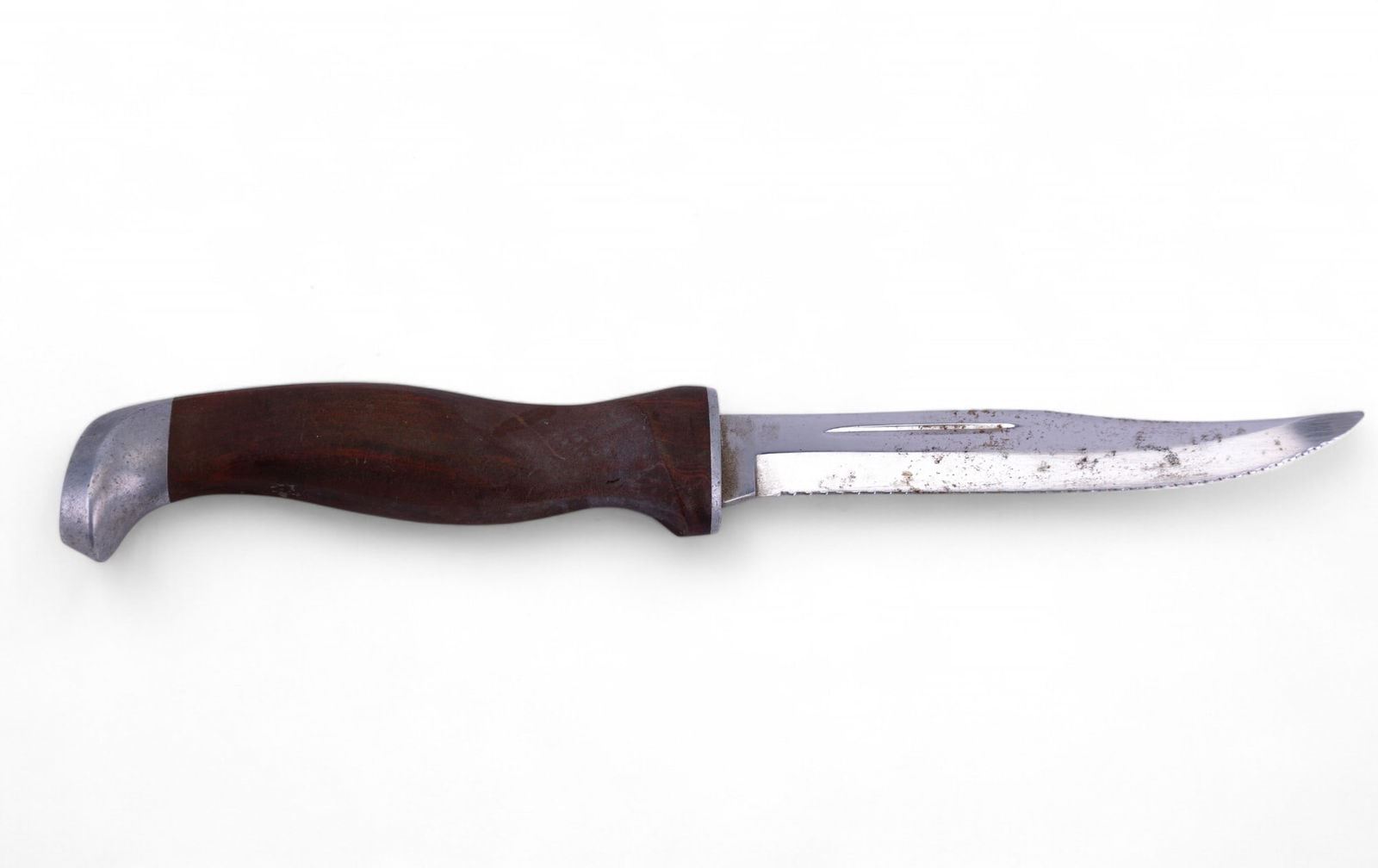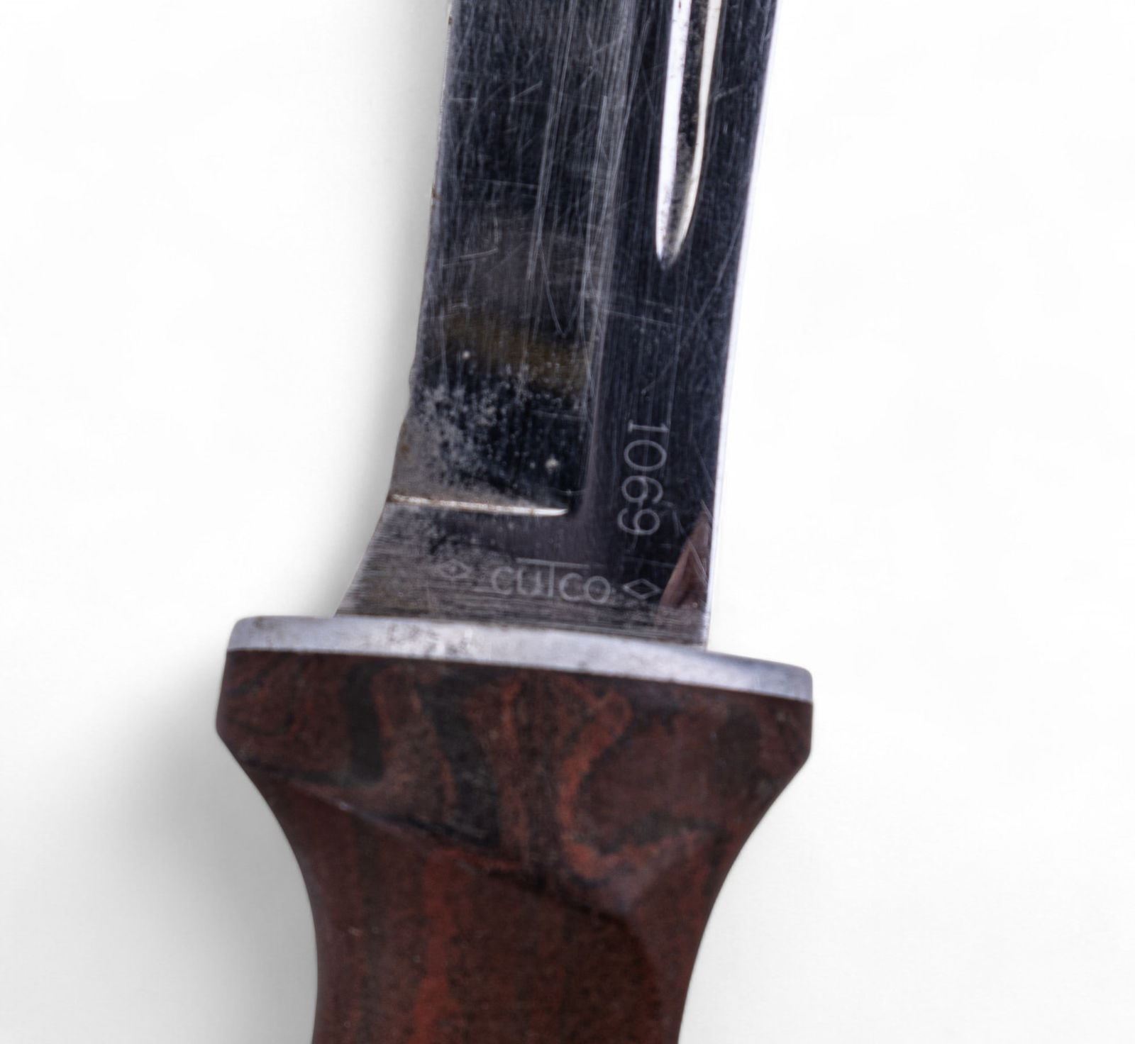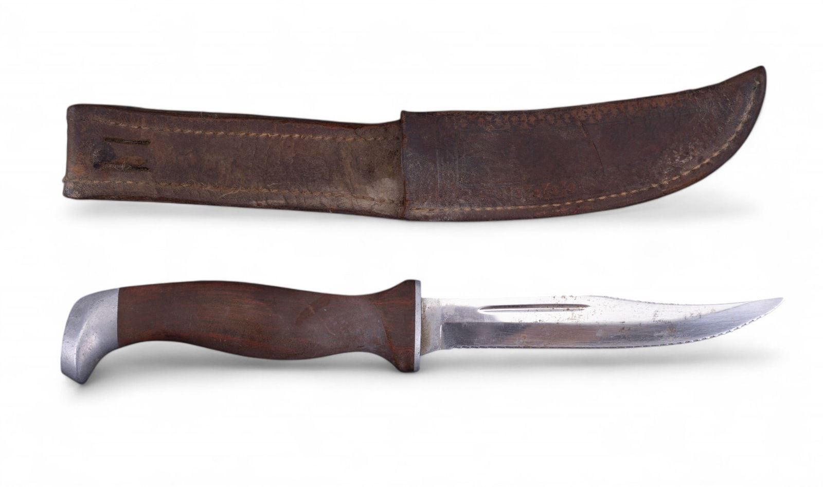 Vintage 1960's Cutco 1069 serrated hunting knife w/ leather sheath. Knife measures approx.10.25" long.