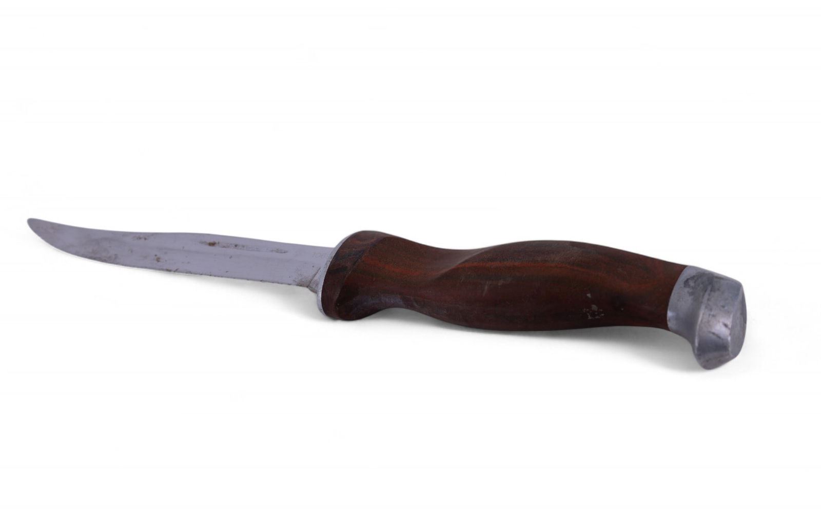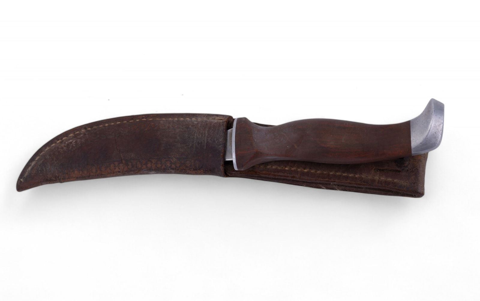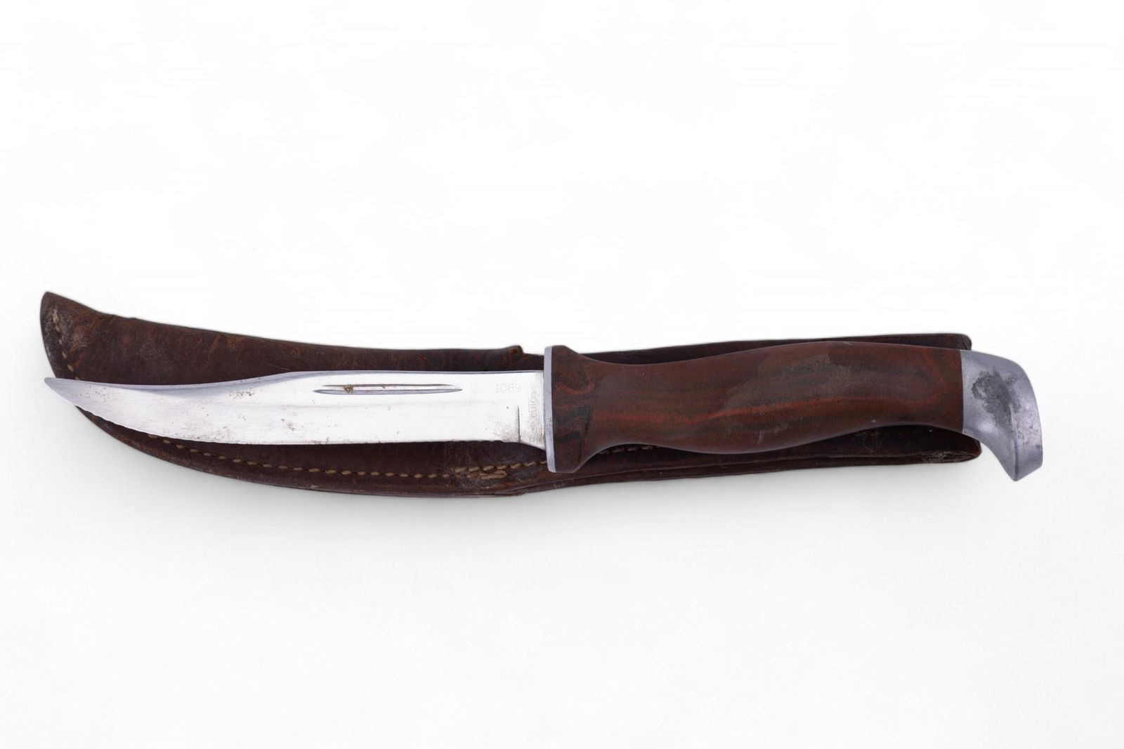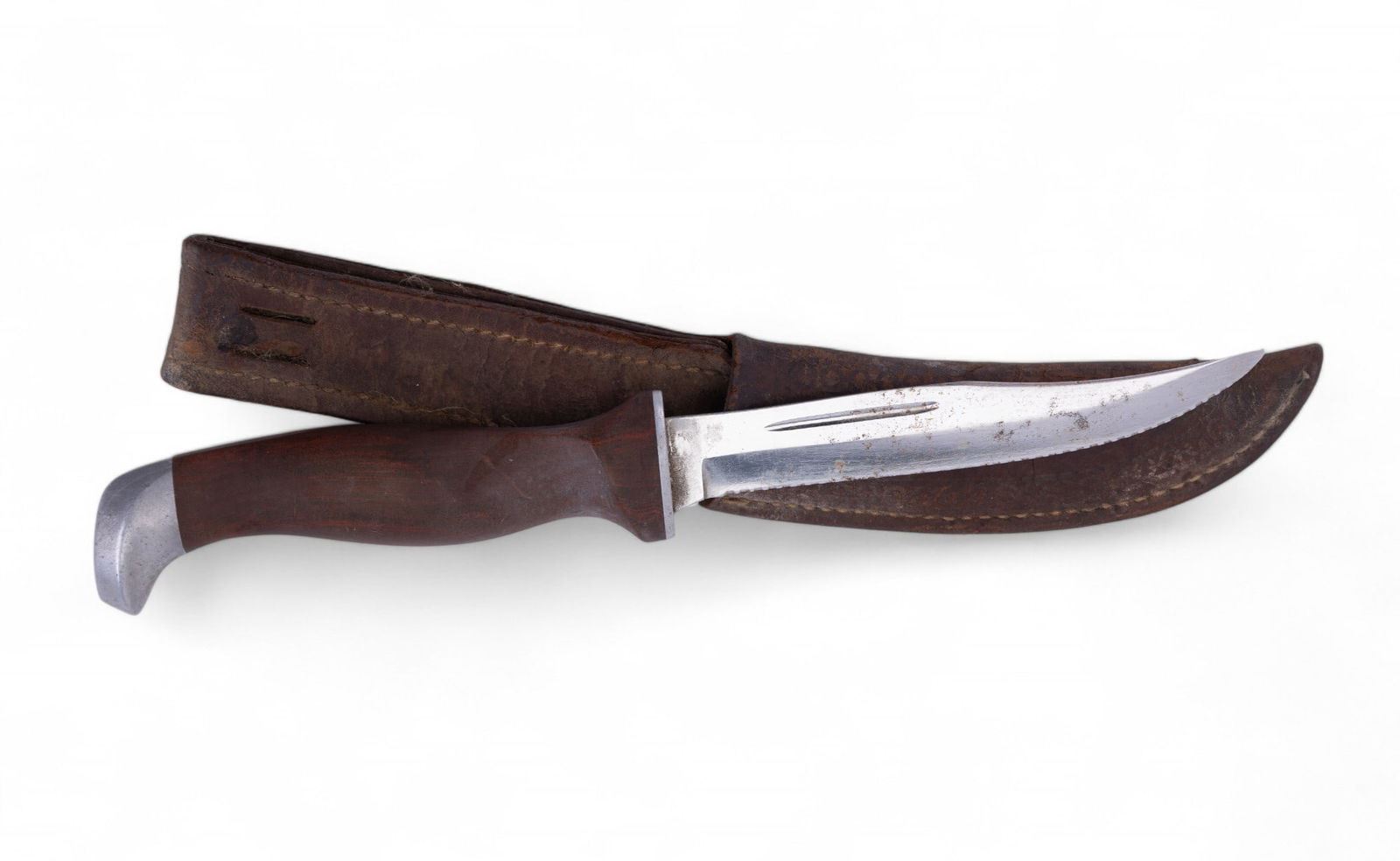 Vintage 1960's Cutco 1069 serrated hunting knife w/ leather sheath. Knife measures approx.10.25" long.