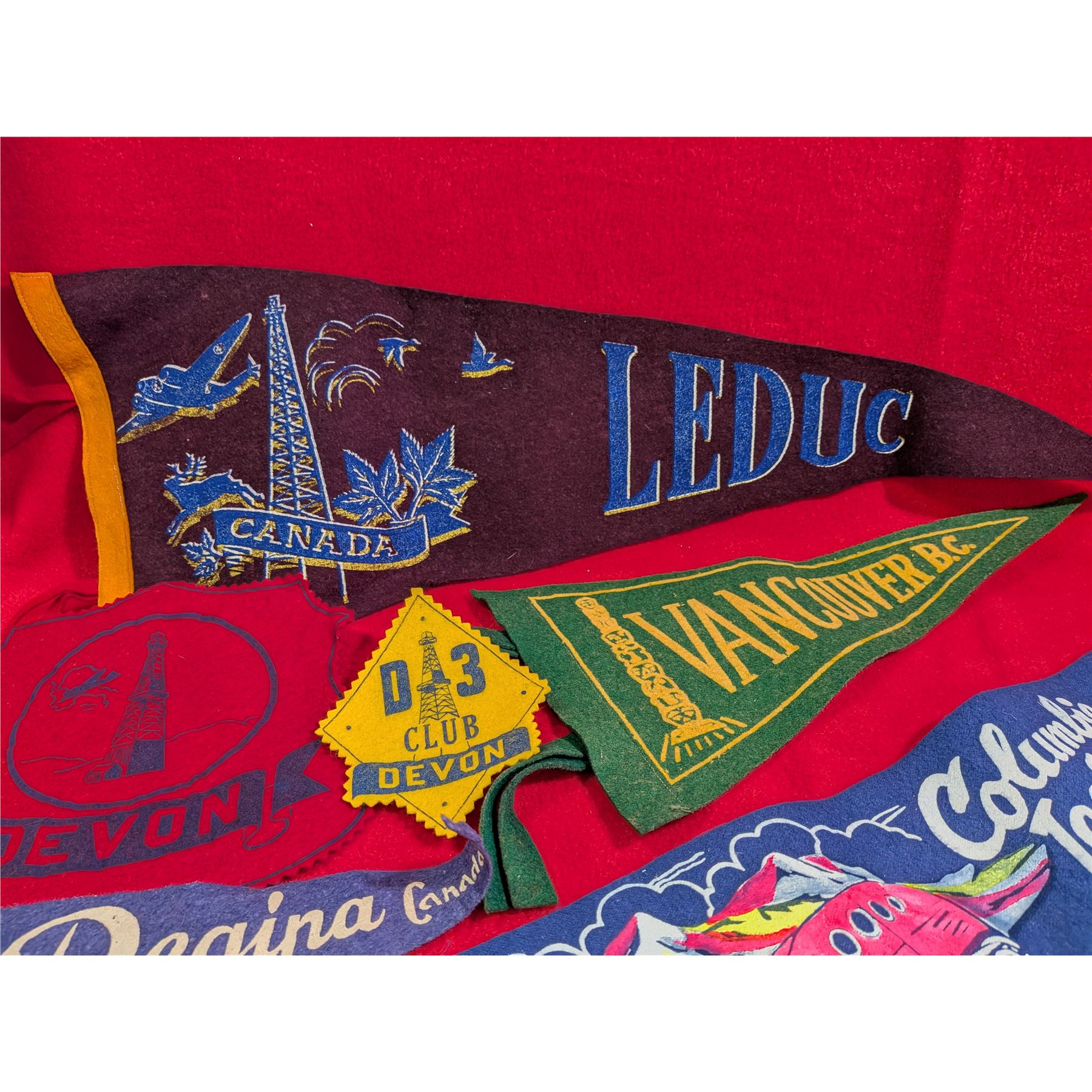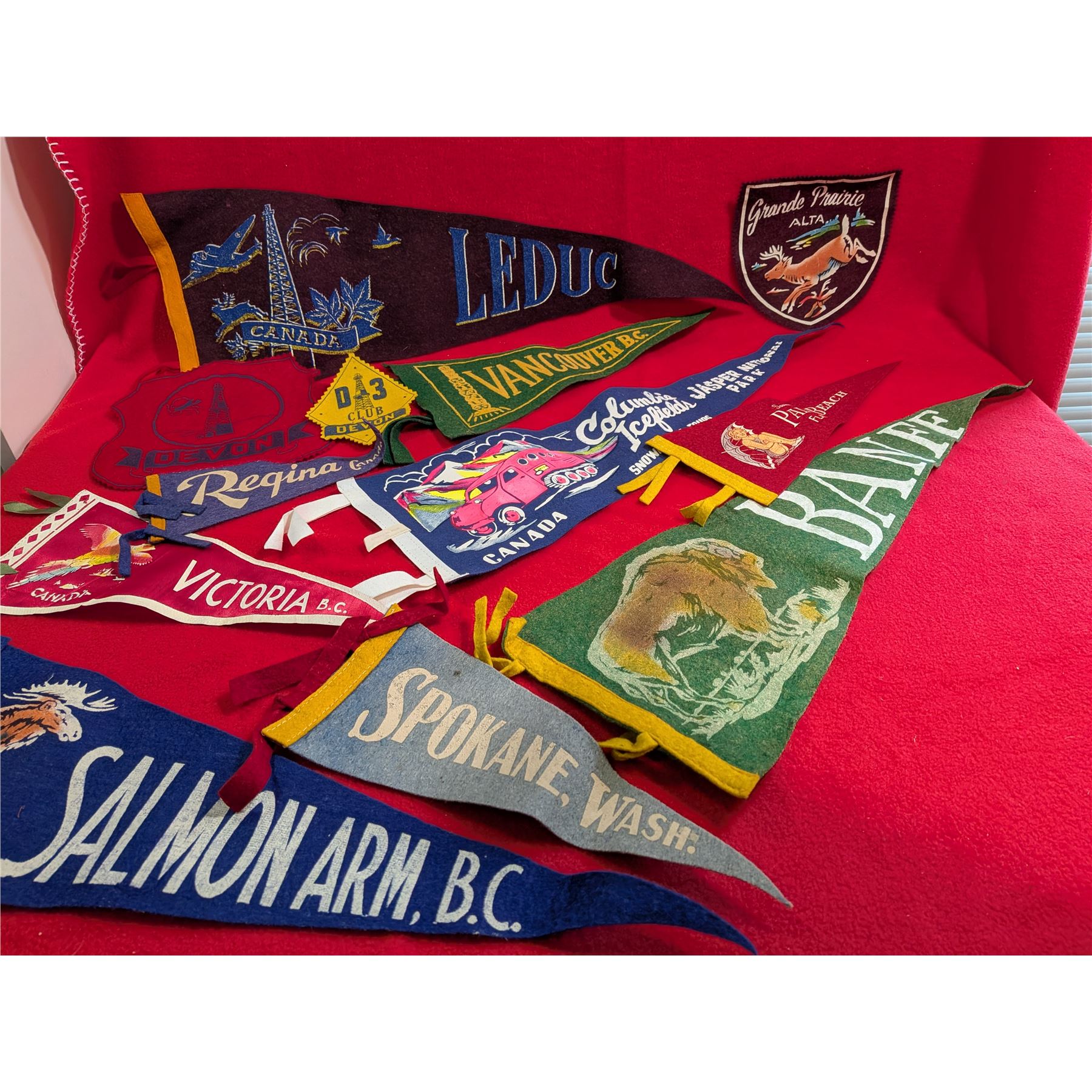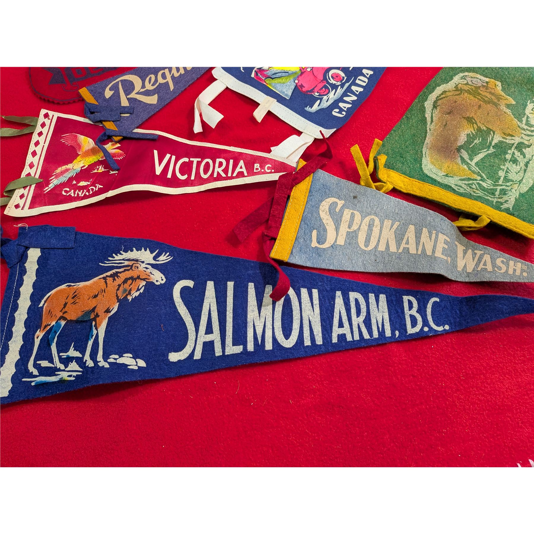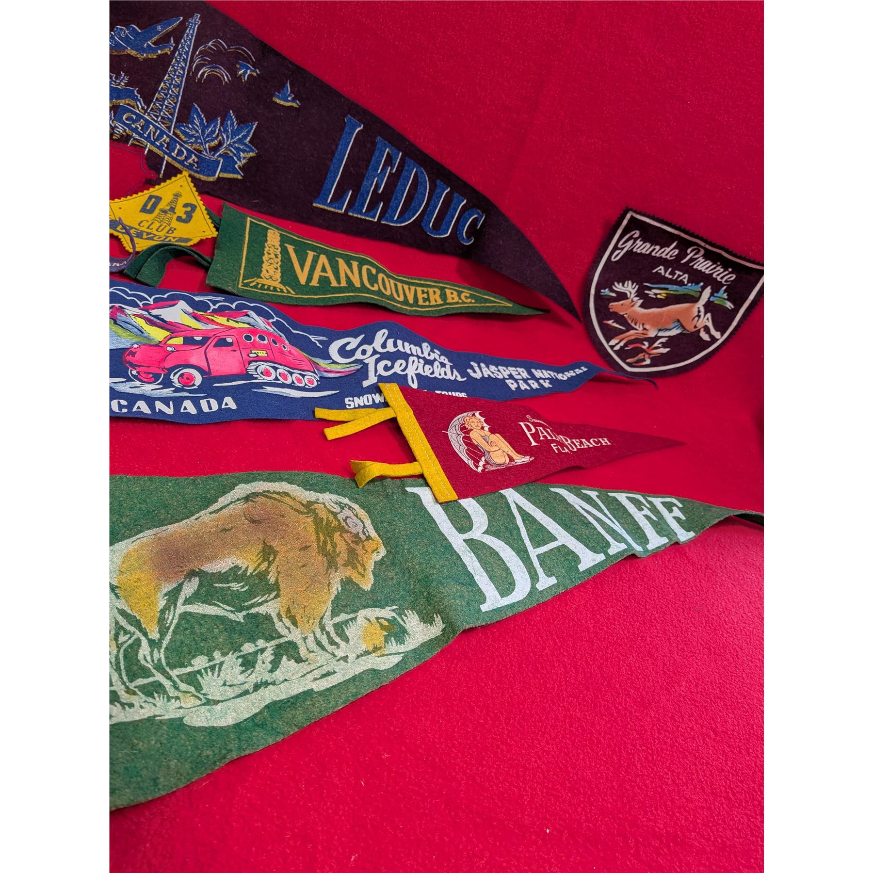 Vintage Canadian felt souvenir pennant flags from the 1960s-1970s.