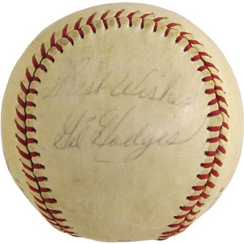 <B>1960's Gil Hodges Single Signed Baseball.</B></I> A true blue Dodger, Hodges spent close to two decades of his life in service of the squad on both coasts before closing out his career as a player for the new Mets squad, and later as their manager. Yet despite this long tenure on the Major League Baseball diamond, singles from this fan favorite are few and far between. We offer here a nice example from the small available supply, a side panel inscription reading, "Best Wishes, Gil Hodges." The "Official Pro League" brand baseball is lightly and evenly toned, making a perfect home for Gil's 7/10 ink. <I>LOA from PSA/DNA.</B></I>