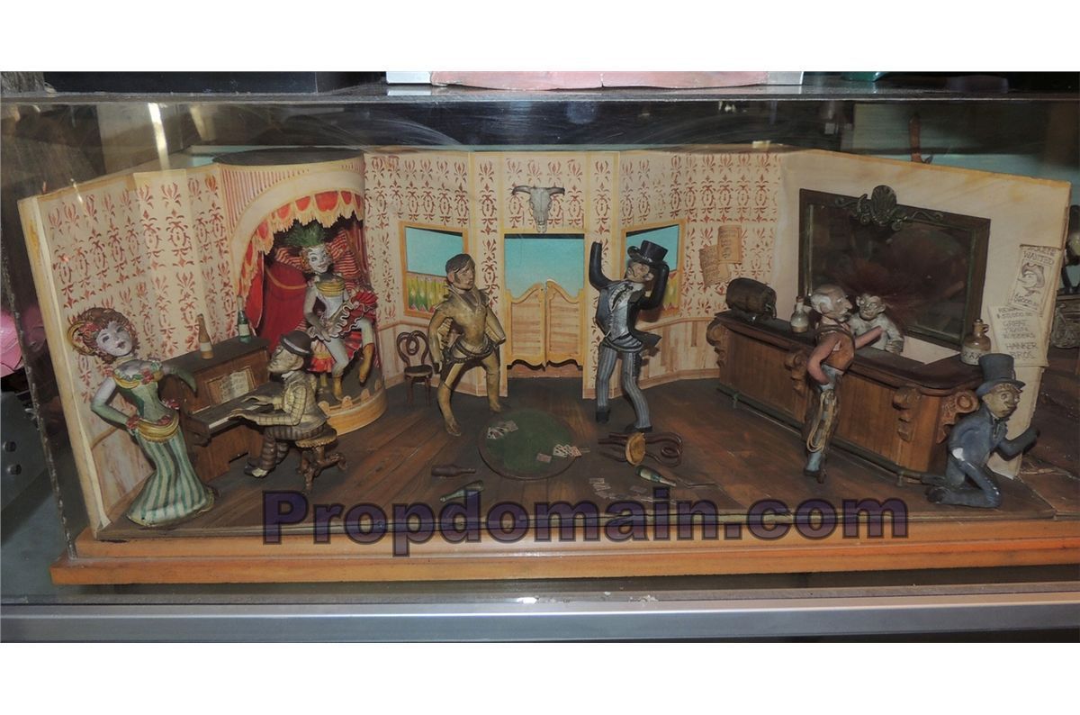 The one case holds both the inside and outside dioramas. The inside one shows the Saloon and several characters caught in a classic moment of the old west. The outside one has an old dilapidated covered wagon, the graveyard, and other characters.