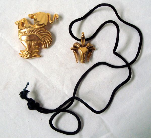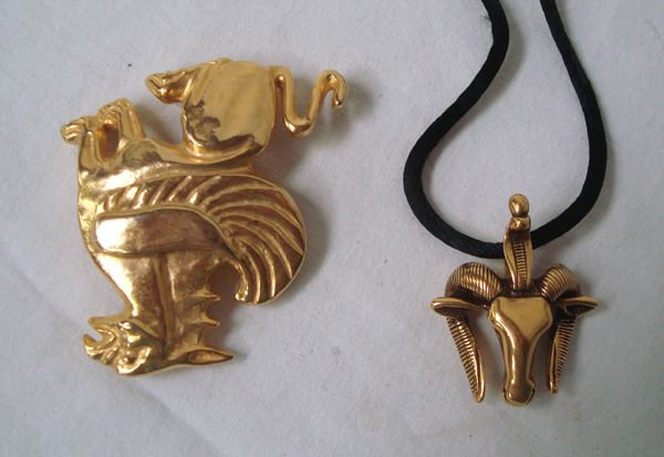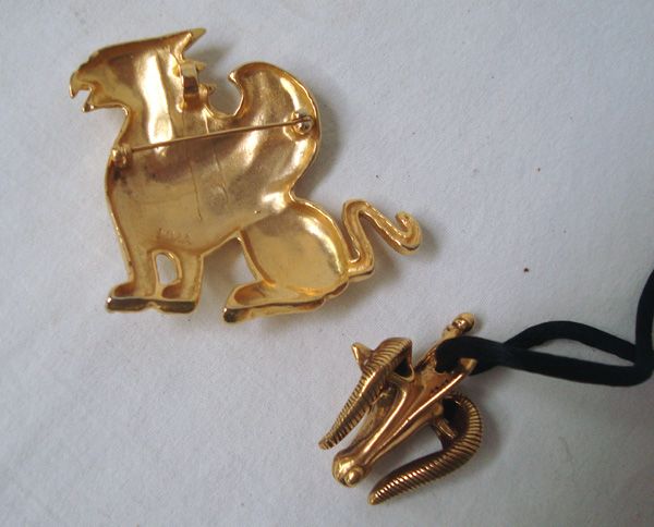 1960's Museum Reproduction Egyptian Pin & Pendant. Wonderful golden pieces, the pin depicts a Griffin and is approx. 2''H x 2 1/4''W. The pendant, which is on a 30'' silk cord measures approx. 1 1/2''H x 1 1/8''W