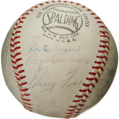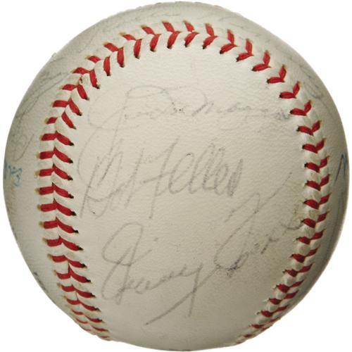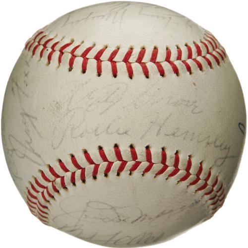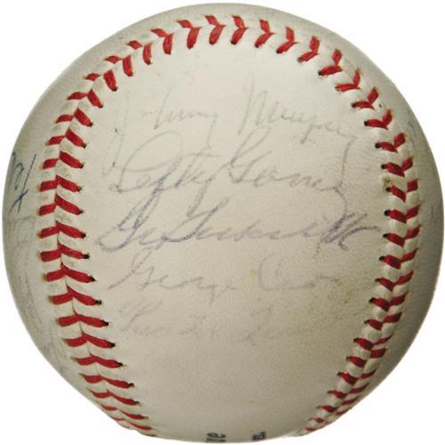<B>1960's Old Timers Day Multi-Signed Baseball with Two Jimmie Foxx Signatures.</B></I> This incredible ONL (Giles) ball derives from an event we sure wish we could have attended, as the cast of characters is simply outrageous. Among the seventeen signatures that coat the pale white horsehide are DiMaggio, Grove, Appling, Dickey, Lyons, Gomez, Feller and a pair of Foxx autographs with the rare "Jimmy" spelling. Signature quality ranges from 6/10 to 9/10 for the names listed, with only a single unlisted name dipping below that range. <I>LOA from PSA/DNA. LOA from James Spence Authentication.</B></I><BR><BR><b>Shipping:</b> Balls, Pucks, etc., Small (<a target="_blank" href="http://www.heritageauctions.com/common/shipping.php">view shipping information</a>)