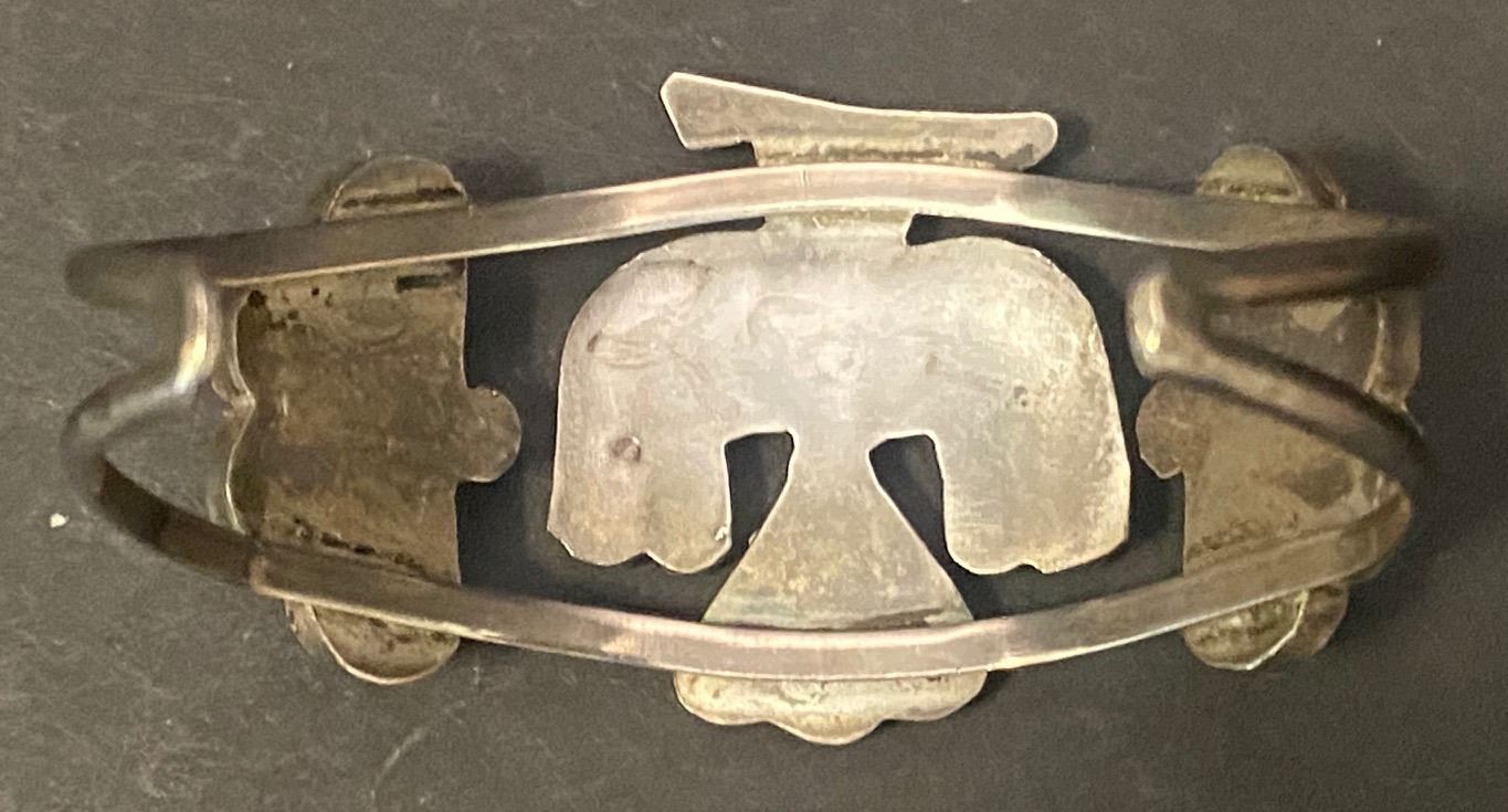 Bracelets measurements are opening, inside circumference, height.  Weights are in Grams and are weighed to the best of our ability.  The term signed means that, in our opinion, the signature is by the artist. All dating, Turquoise and hallmark attributions are to the best of our knowledge. Attributions are subjective and should be taken as such. Attributions in the description of any lot is left to the buyer to determine accuracy and the gallery is not responsible for any errors or omissions.