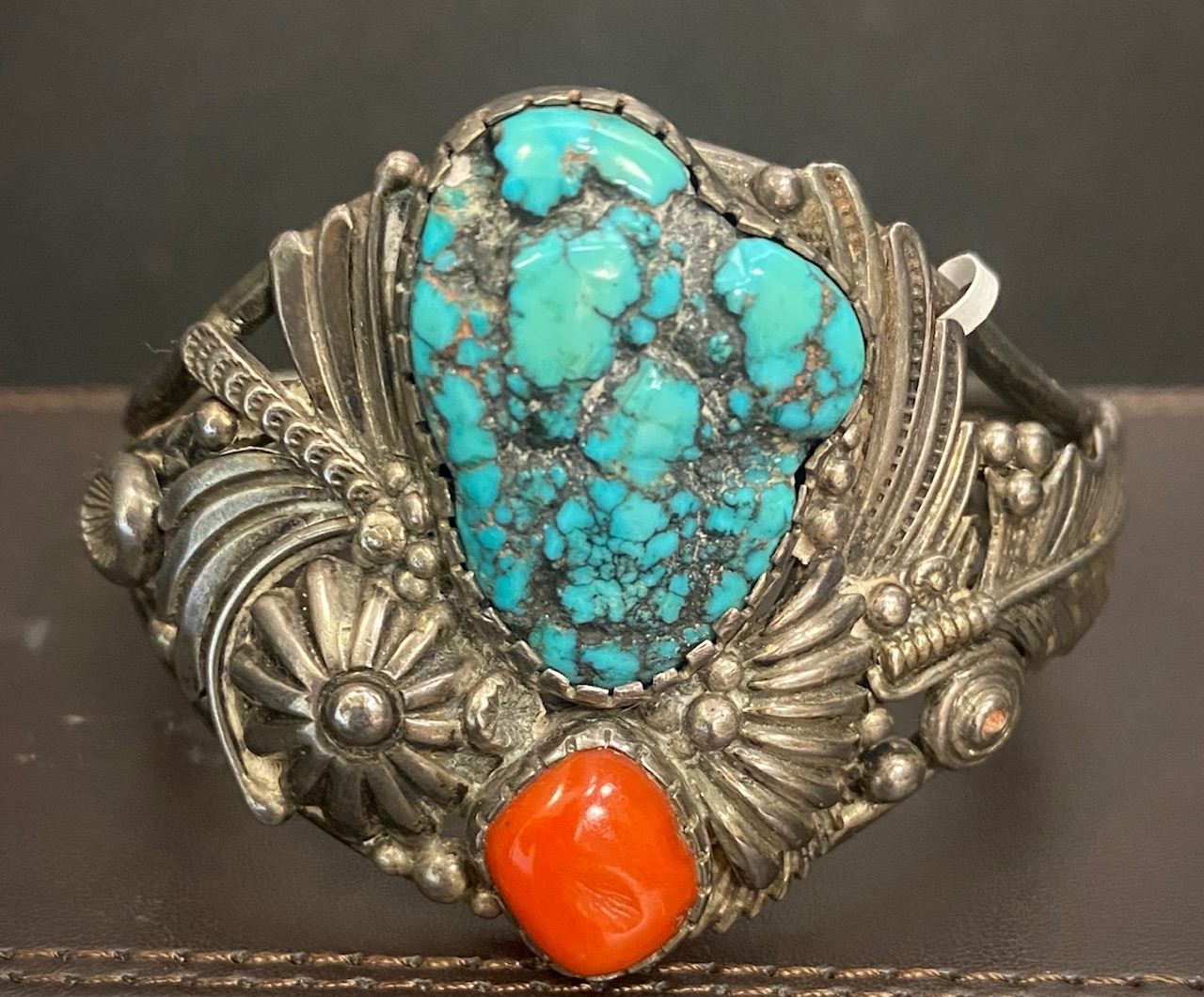 1960's T. Curtis Sr. Spider Web Kingman Turquoise and Coral Cuff. Thomas Redhorse was given Curtis as nickname 1945-2013 1 3/4"H X 5 1/4" inside X 1 1/4" opening
