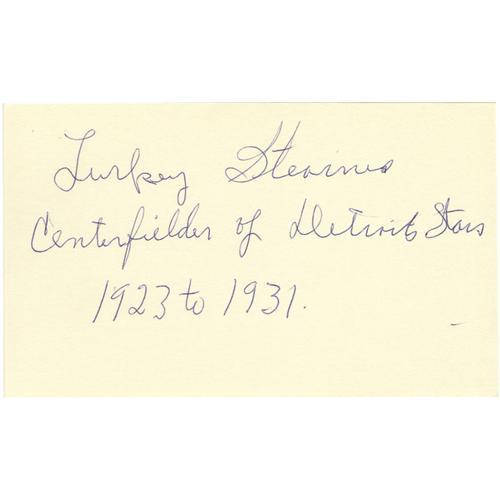 <B>1960's Turkey Stearnes Signed Index Card.</B></I> He spent his summers clubbing homers for the Detroit Stars and his winters working the assembly lines in Motor City's auto plants. Satchel Paige claimed "He was as good as anybody who ever played baseball," and his 2000 Hall of Fame induction proves that many agree. His tough autograph appears on this blank 3x5" index card in its most desirable "Turkey Stearnes" style (most signatures use his given name of Norman). He adds to the tremendous appeal with the notation "Centerfielder of Detroit Stars 1923 to 1931." All ink and the index card itself are Mint. <I>LOA from PSA/DNA.</B></I>