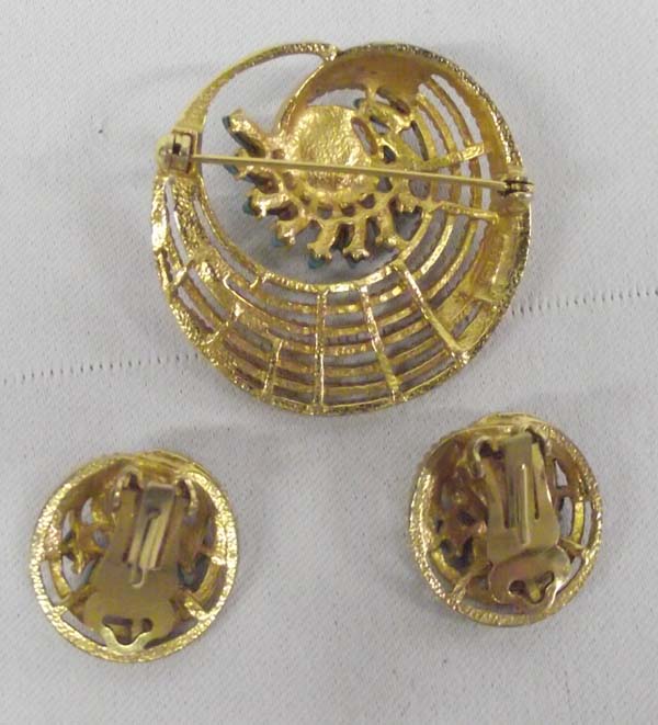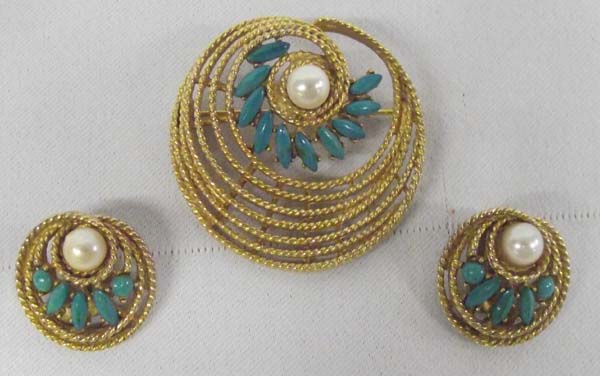 1960s Artco Pin & Earrings Set. Gold color set with turquoise and pearls. Largest piece measures approx. 1 3/4'' diameter, clip on earrings approx. 1'' diameter. Buyers Pay Actual Shipping and Handling Charges(see terms and conditions for more information).