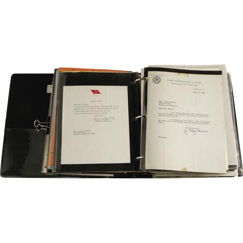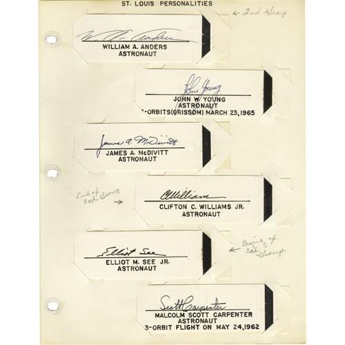 <B>Huge 1960s - 1970s Autograph Collection With an Emphasis on Astronauts.</B></I> This 3" thick binder contains hundreds of autographs as assembled by Mrs. Loraine Runion of St. Louis. Her primary collecting method consisted of sending a white matchbook cover to a celebrity and requesting it be autographed. Those covers returned with signatures were harmlessly slid into diagonal cuts on blank pages. The autographs were occasionally supplemented with relevant newspaper clippings, photographs, and illustrations. "People in the news" from all walks of life grace these pages, however America's astronauts are the dominant and most comprehensive group here. Over 80 NASA signatures are present with Charles Conrad's being the only evident autopenned autograph. Highlights include the following: Scott Carpenter, Roger Chaffee, Gordon Cooper, Virgil Grissom, Sally K. Ride, Walter M. Schirra, Elliot See, Alan B. Shepard, Donald K. Slayton, Edward White, Clifton C. Williams, and John Young. There is also a full color "bubble gum" card signed "<I>Virgil Grissom</B></I>" which shows the doomed astronaut suiting up. Other prominent signatories in the Runion Collection are such diverse luminaries as Mikhail Baryshnikov, General Omar Bradly, George Bush, Sr., Bob and Elizabeth Dole, General James H. Doolittle, Mamie Eisenhower, John Nance Garner, J. Edgar Hoover, Hubert Humphrey, Ladybird Johnson, Gene Kelly, Thurgood Marshall, the Nixon daughters, and Adlai Stevenson. A collection worthy of further study and certainly evocative of its day. Overall fine condition.<BR><BR><b>Shipping:</b> Books & Catalogs (<a target="_blank" href="http://www.heritageauctions.com/common/shipping.php">view shipping information</a>)