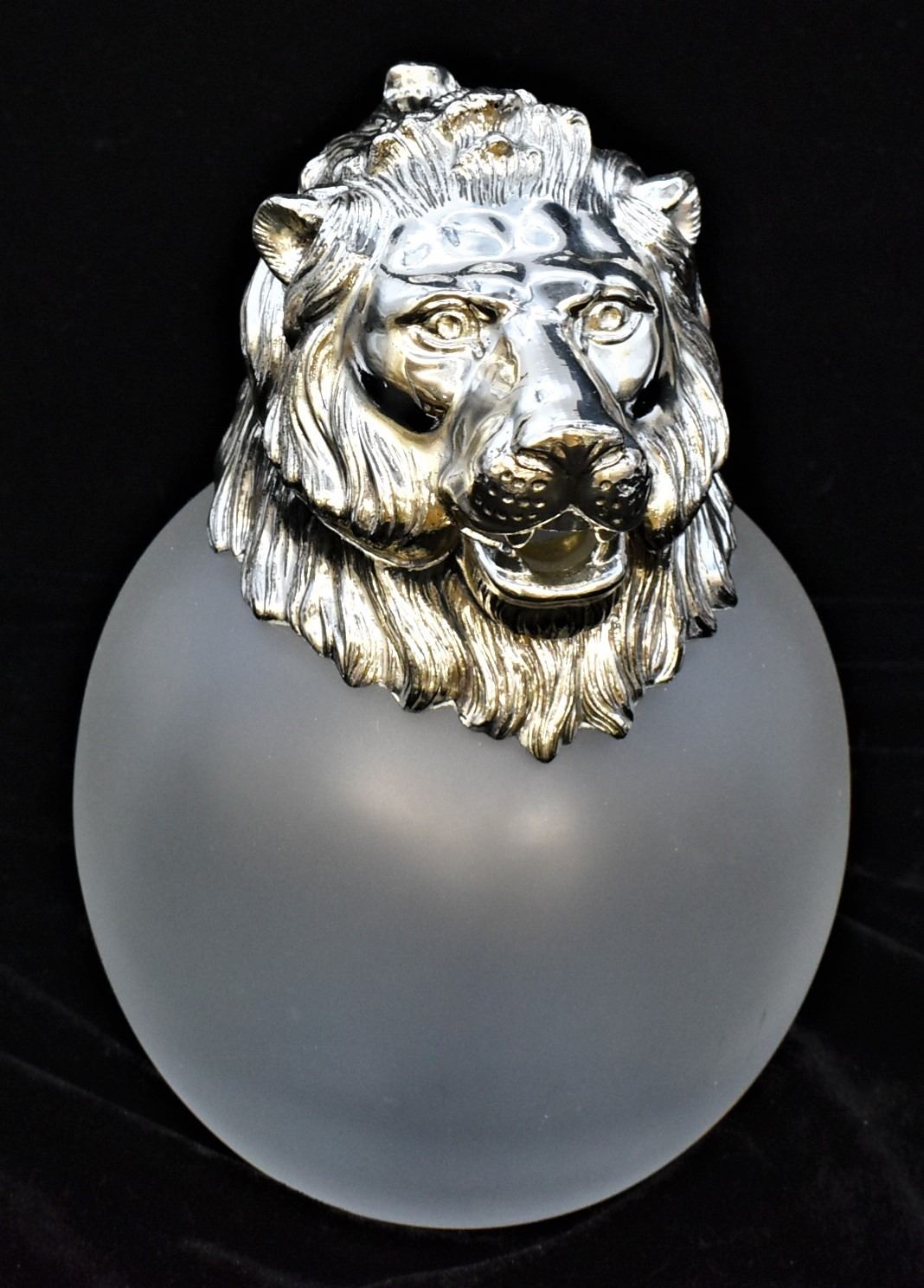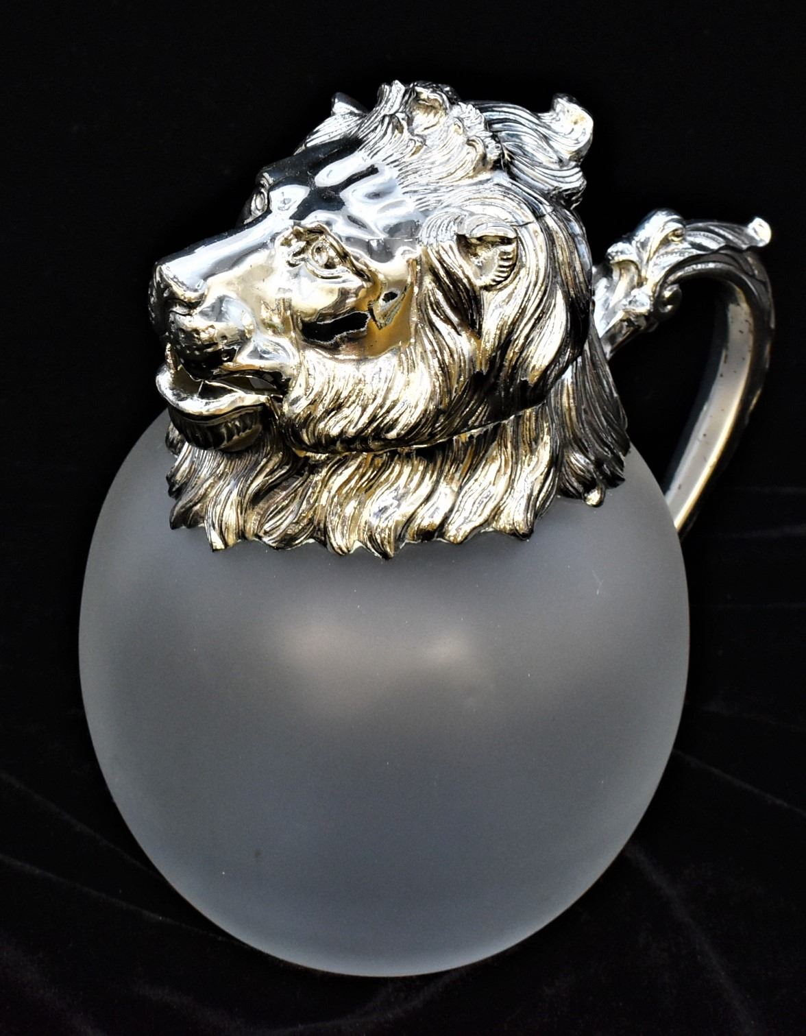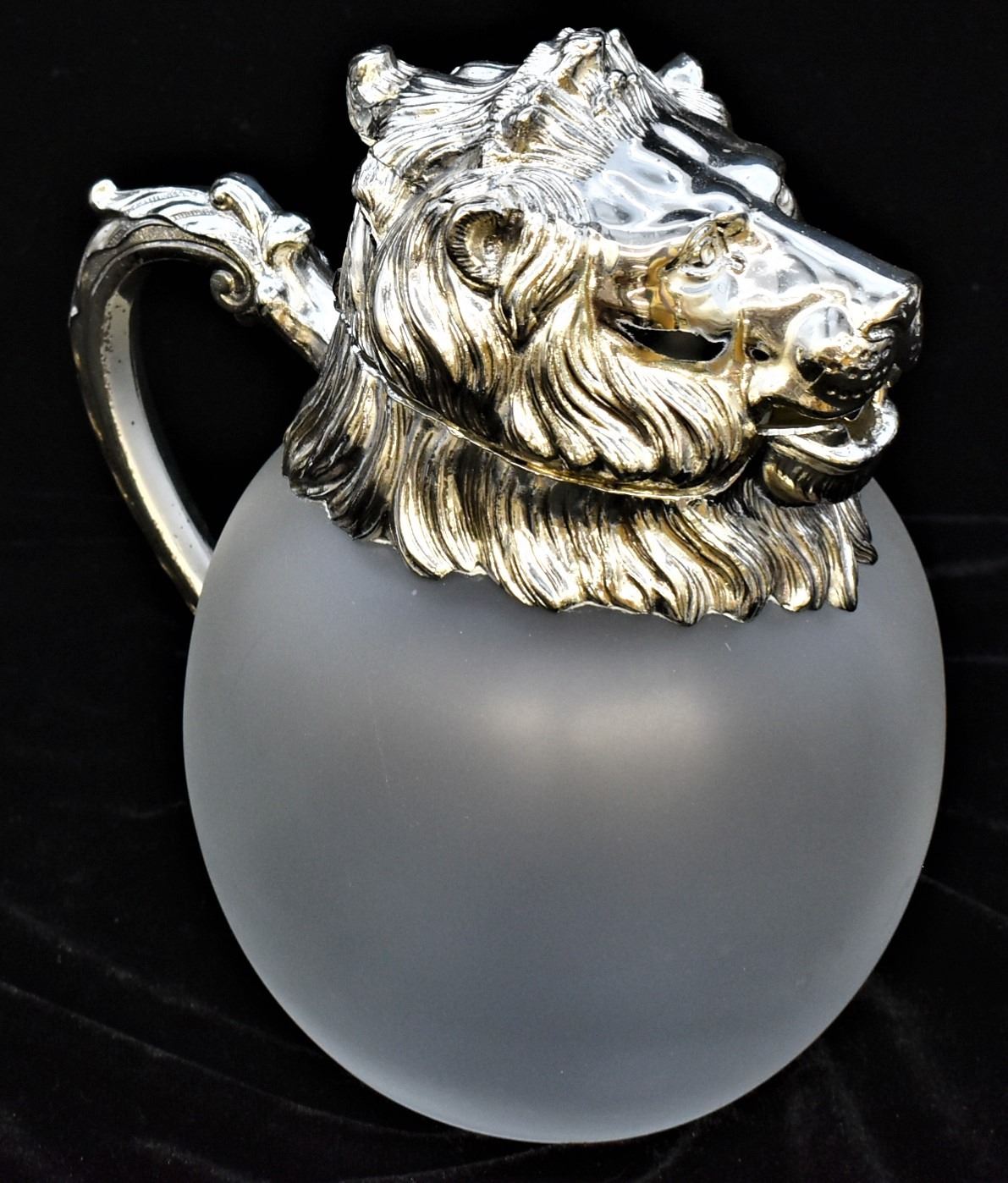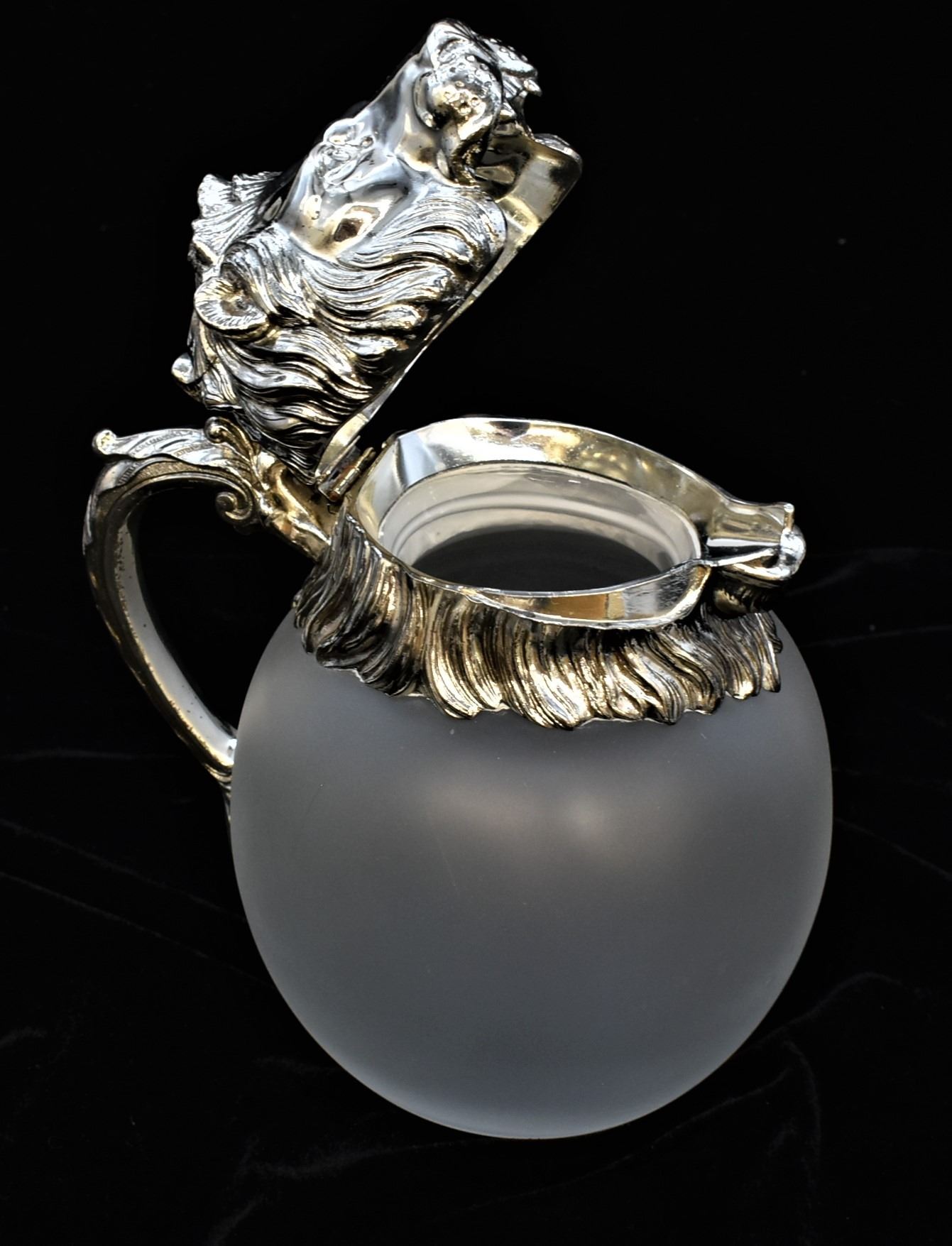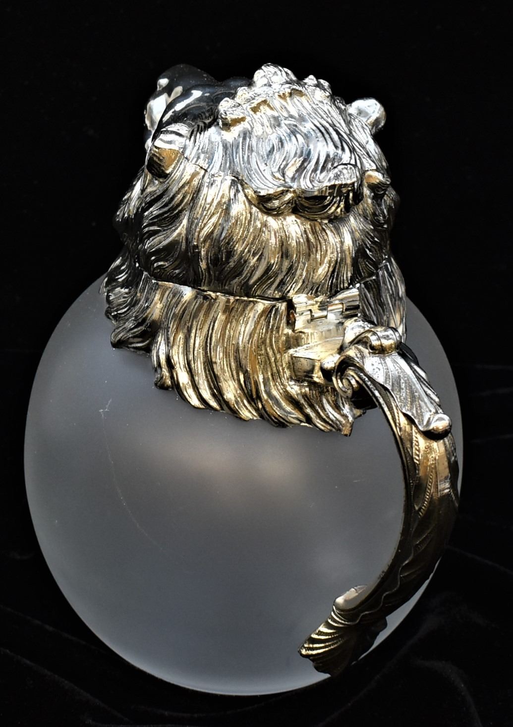 1960s Carole Stupell Hollywood Regency Lion Pitcher, Silver Gilt Ormolu Lion's Head Spout and Handle, Frosted Glass Bubble Pitcher, frosted glass bubble pitcher, from the high-end Carole Stupell Boutique in New York City. The lion's mouth serves as the spout, measures 5.5''W x 7''D x 8''H, weighs 3 lbs. .38 oz.