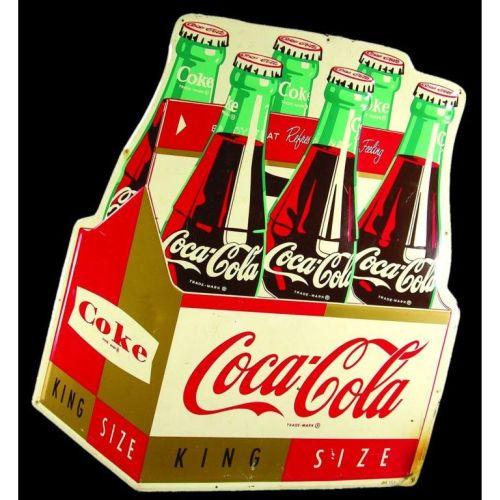 1960s Coca Cola Embossed Die Cut Tin Sign, six pack. Some stains and dent at 4:00 otherwise very good condition. 30 1/2 X 36 inches.