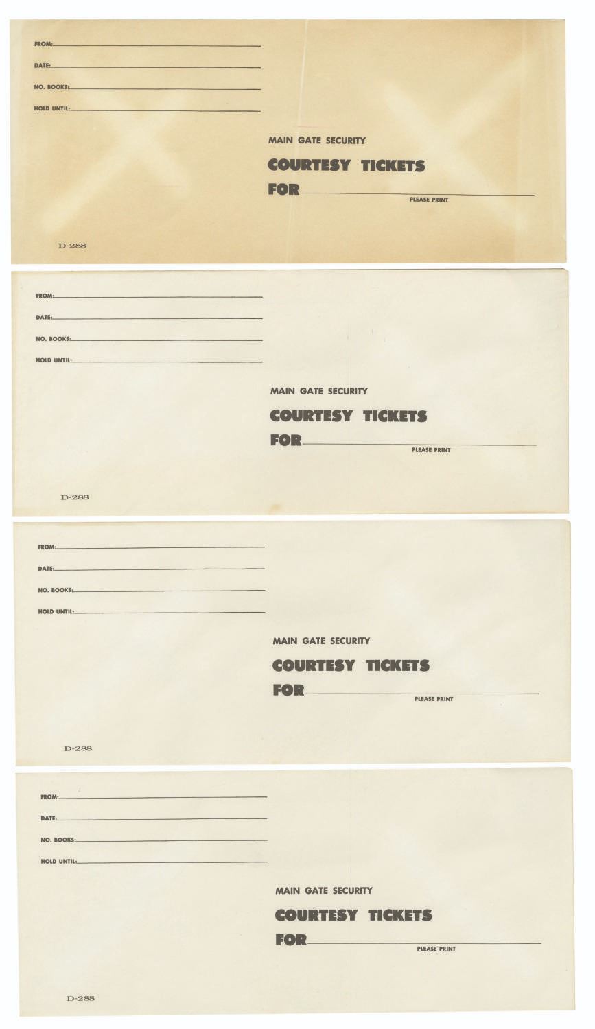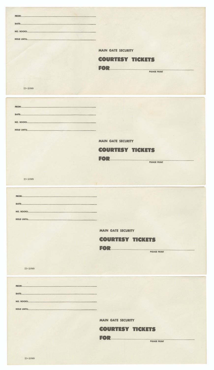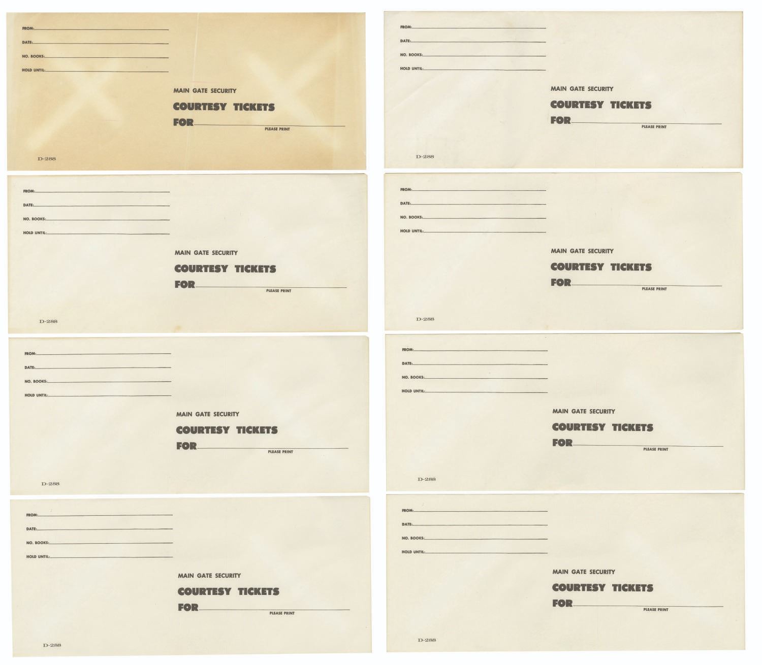 (Disneyland,1960s) Eight unused courtesy ticket envelopes from Disneyland Main Gate Security. Measuring 4.25" x 9.5", the envelopes are overall in very good condition, with two in good condition showing discoloration from age and handling wear.