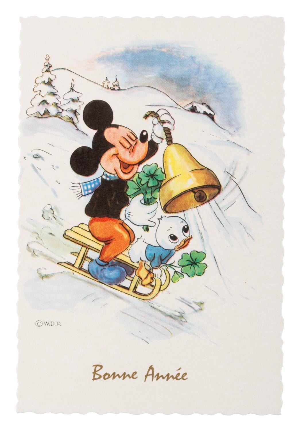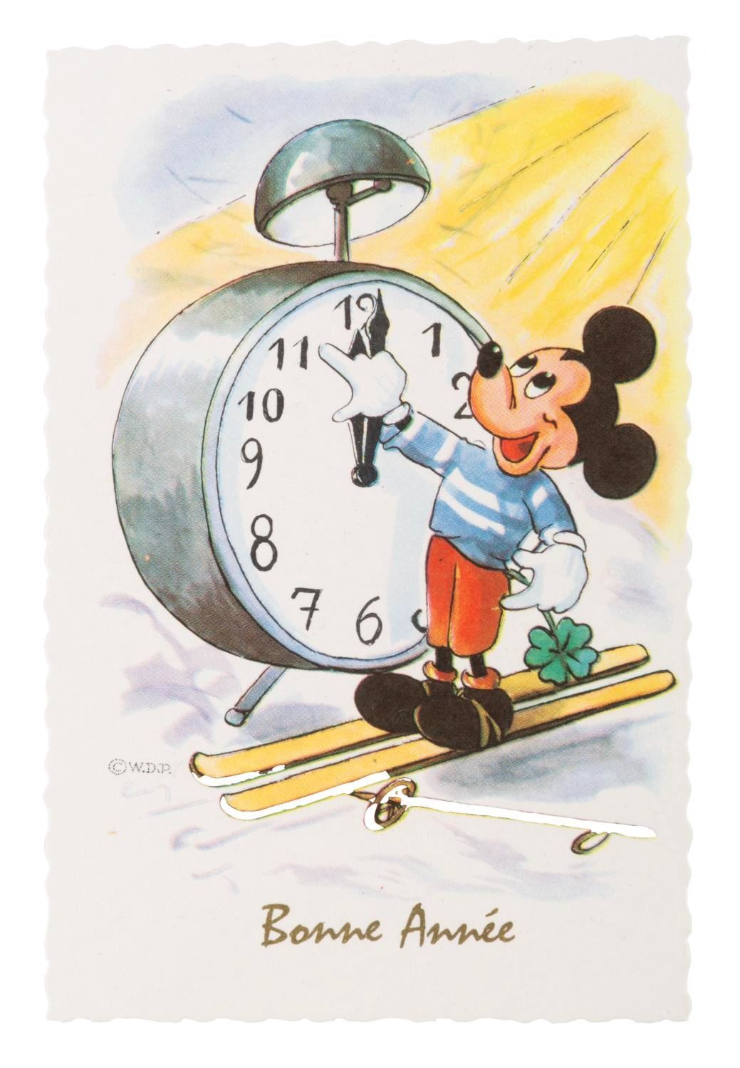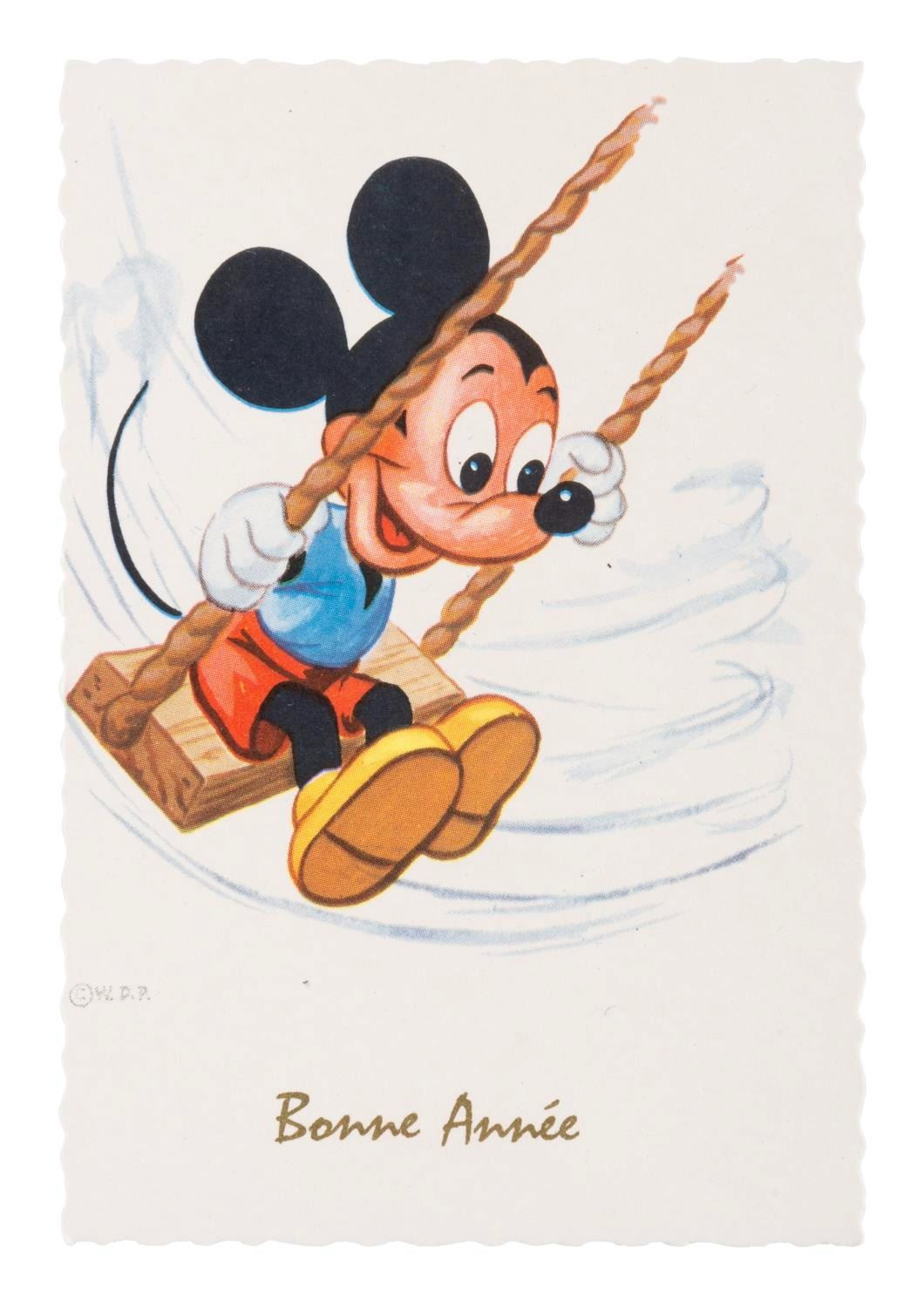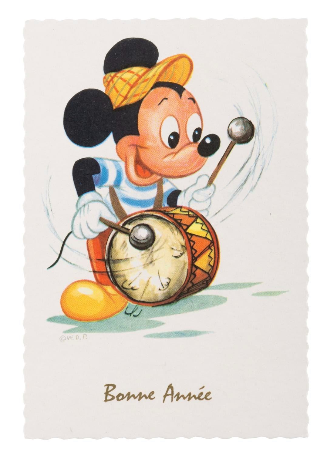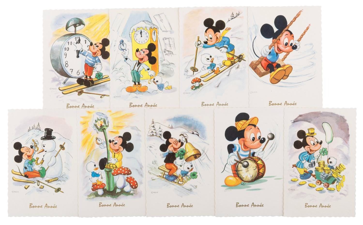 (Disney, 1960s) A set of nine French Bonne Annee (Happy New Year) cards featuring Mickey Mouse. Each measuring 2.75" x 4", the cards are in very good to fine unused condition with light pencil marks on the back.