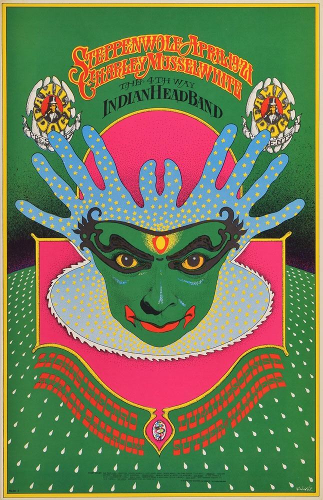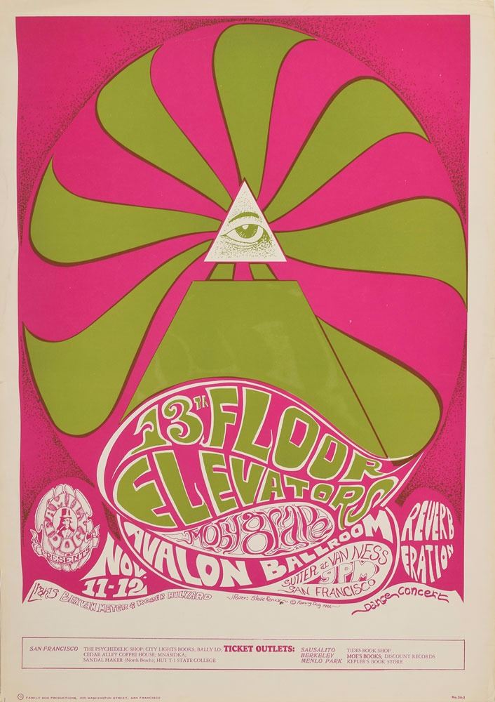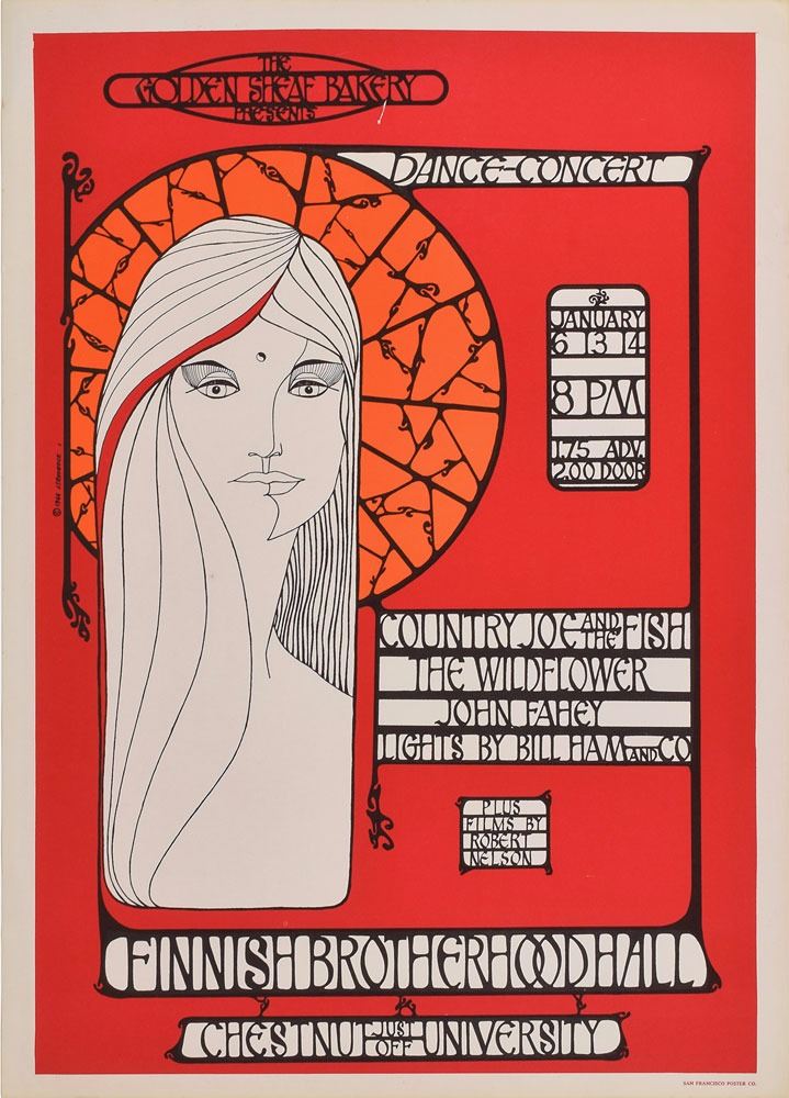 Group of three classic 1960s California concert posters, including: an original color 14.5 x 20 poster for Country Joe & the Fish at the Finnish Brotherhood Hall in Berkeley in January 1967; an original color 14.25 x 20 Family Dog poster for 13th Floor Elevator and Moby Grape at the Avalon Ballroom, November 11–12, 1966 (FD-34); and an original color 14 x 21.25 Family Dog poster for Steppenwolf at the Avalon Ballroom on April 19, 1968 (FD-115). In overall fine condition, with some creasing to the 13th Floor Elevator poster.